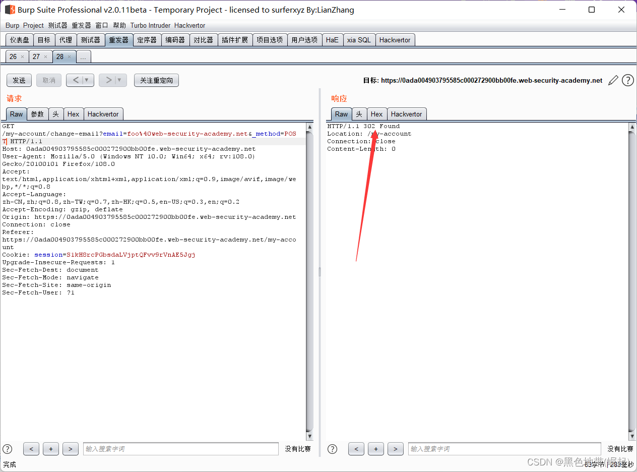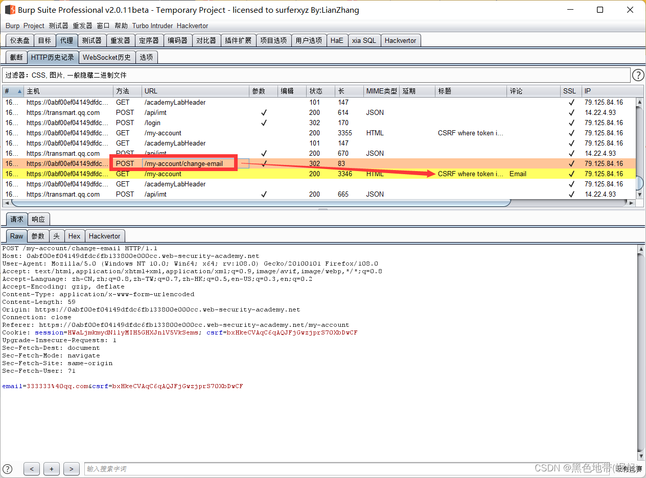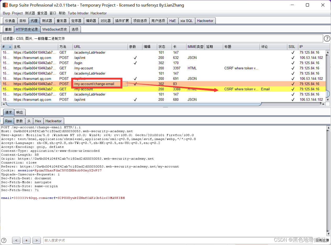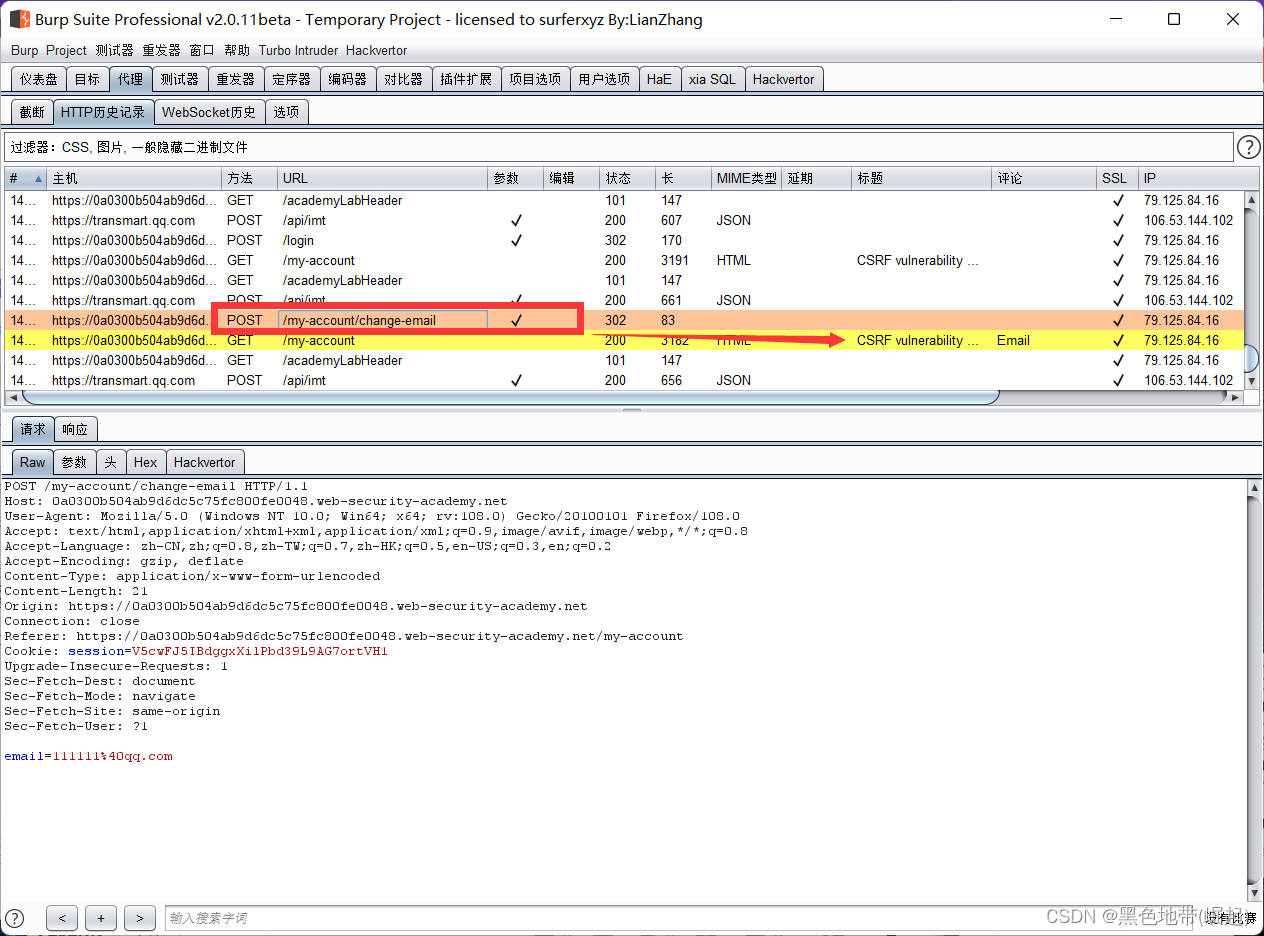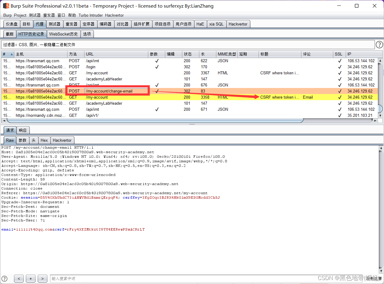 HTTP历史记录选项卡,找到POST /my-account/change-email请求,并确认会话cookie是否包含在内,即使这是一个跨站点POST请求
