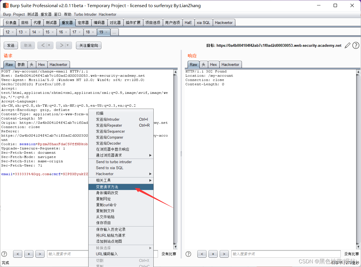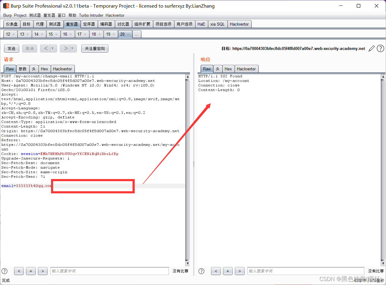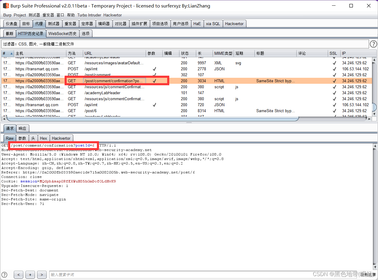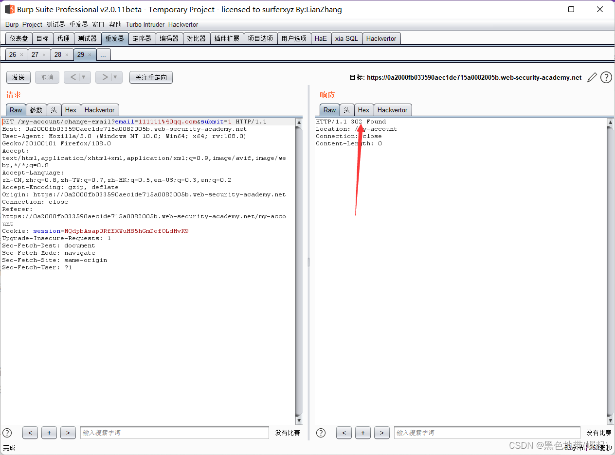 HTTP历史记录选项卡,找到POST /my-account/change-email请求,并确认会话cookie是否包含在内,即使这是一个跨站点POST请求