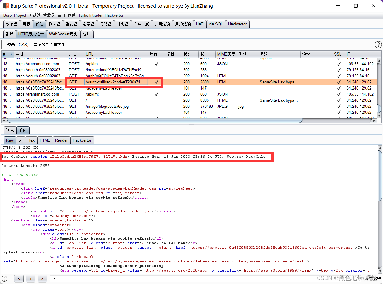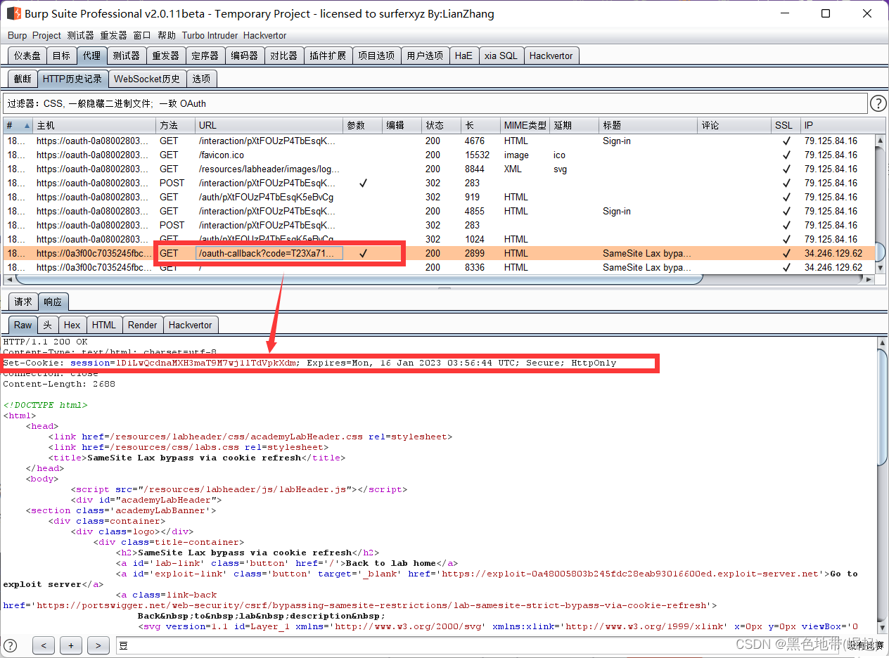 从代理历史记录中可以看到,每次完成OAuth流时,目标站点都会设置一个新的会话cookie,即使已经登录(因为每次请求完他会set-cookie)