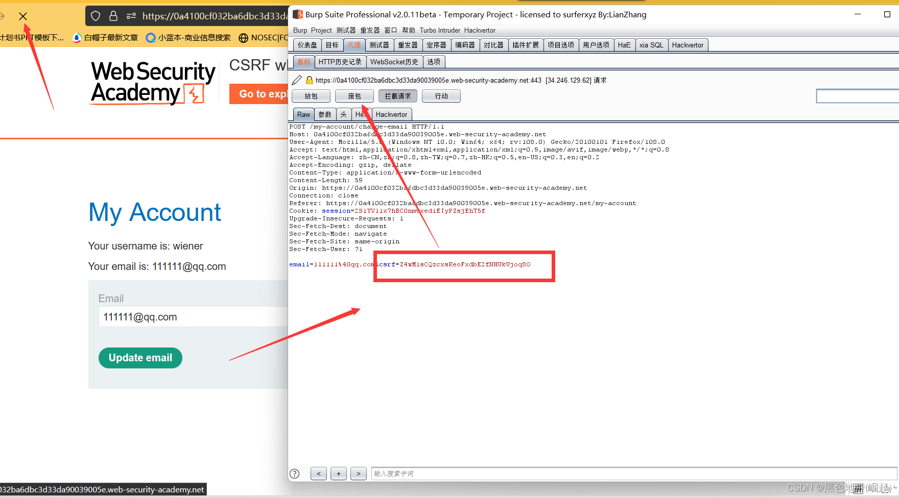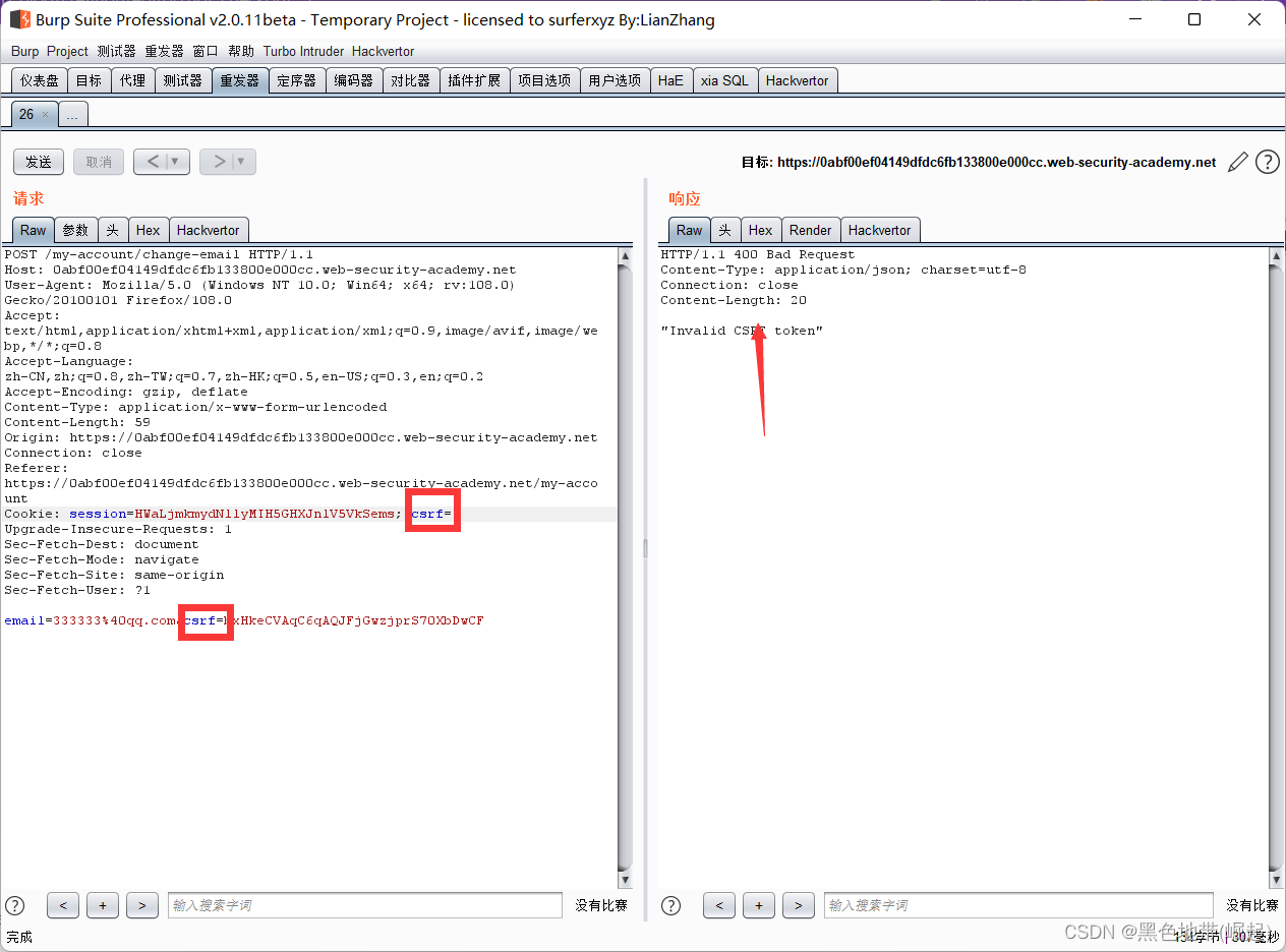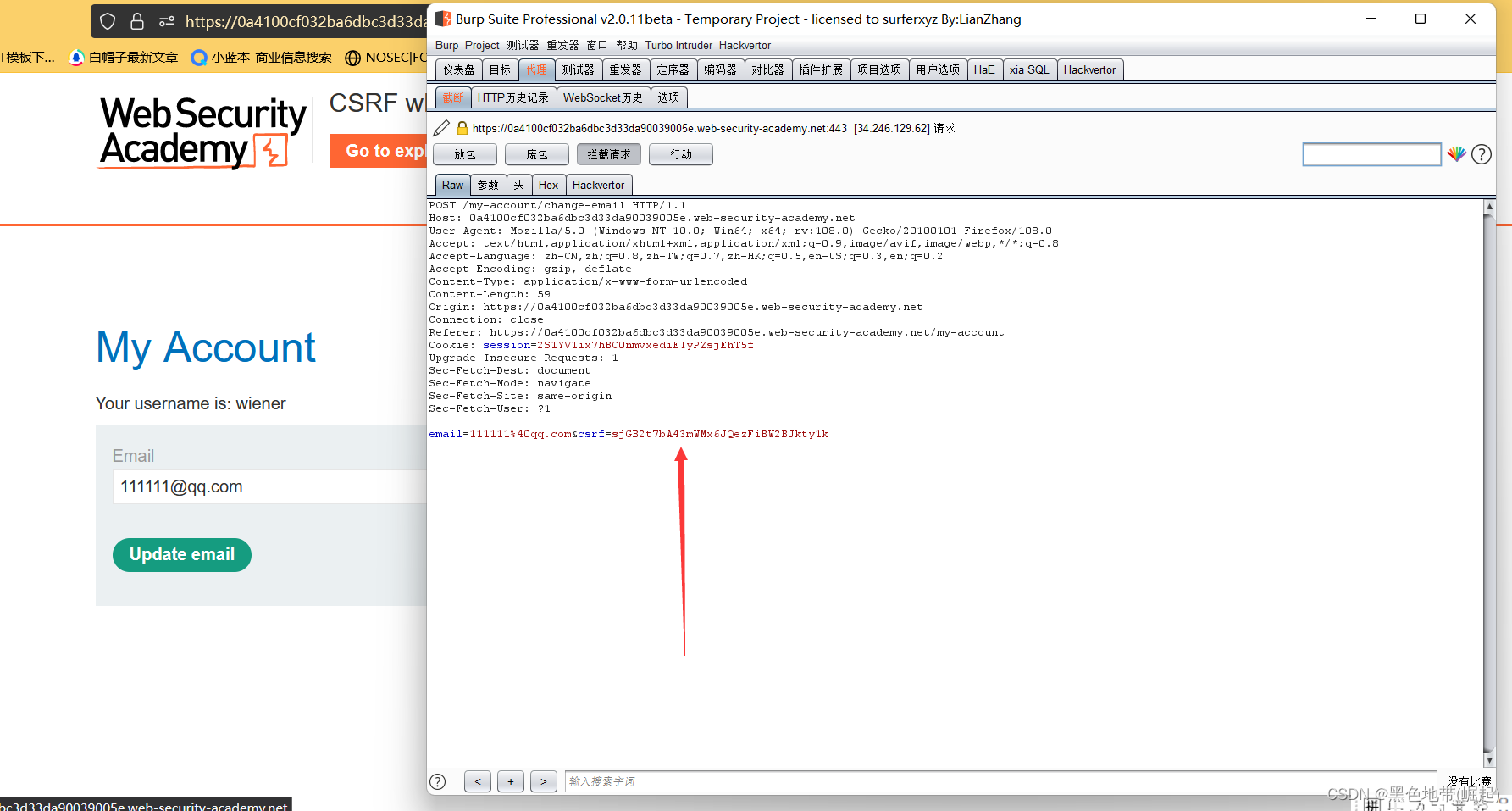 Cookie: session=yvthwsztyeQkAPzeQ5gHgTvlyxHfsAfEemail=wiener@normal-user.com2、这符合CSRF要求的条件: