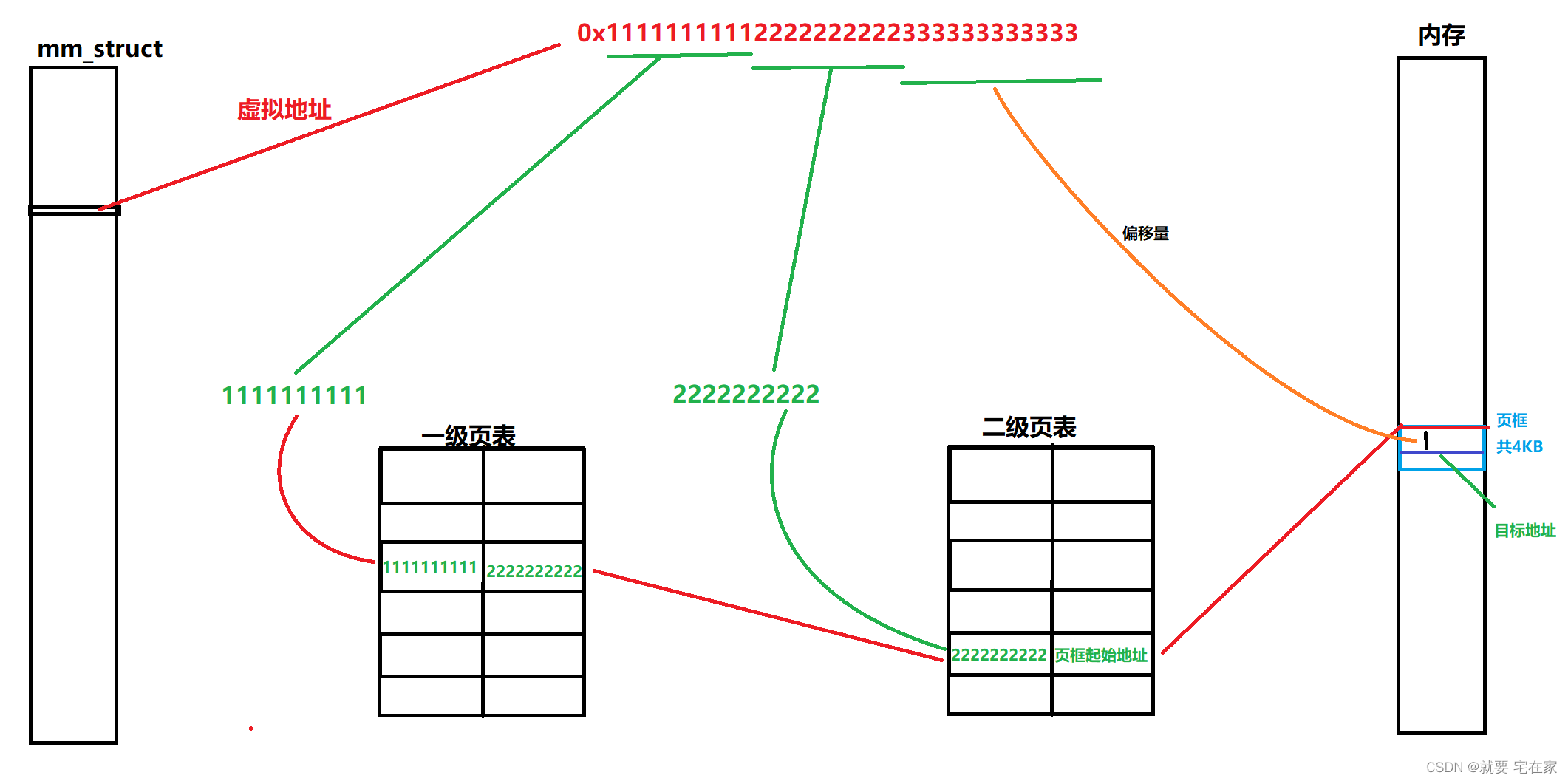 linux将虚拟地址的32位分为前10位、中间10位、后置12位。