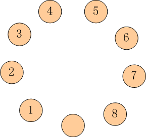 如下图所示: 有 9 只盘子,排成 1 个圆圈。 其中 8 只盘子内装着 8 只蚱蜢,有一个是空盘。 我们把这些蚱蜢顺时针编号为 1 ~ 8。