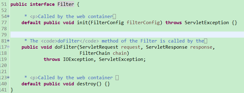 javax.servlet:javax.servlet-api依赖包,这个包里定义的Filter接口的init()与destroy()是有默认实现的,代码如图: