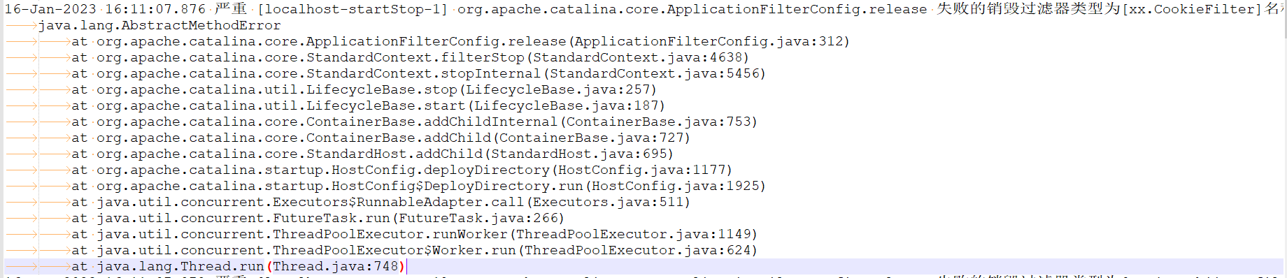 16-Jan-2023 16:11:07.876 严重 [localhost-startStop-1] org.apache.catalina.core.ApplicationFilterConfig.release 失败的销毁过滤器类型为[xx.CookieFilter]名称为[CookieFilter]java.lang.AbstractMethodErrorat org.apache.catalina.core.ApplicationFilterConfig.release(ApplicationFilterConfig.java:312)at org.apache.catalina.core.StandardContext.filterStop(StandardContext.java:4638)...省略其他输出...
