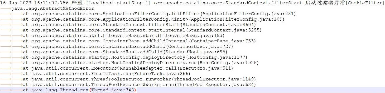 16-Jan-2023 16:11:07.756 严重 [localhost-startStop-1] org.apache.catalina.core.StandardContext.filterStart 启动过滤器异常[cookieFilter]java.lang.AbstractMethodErrorat org.apache.catalina.core.ApplicationFilterConfig.initFilter(ApplicationFilterConfig.java:281)at org.apache.catalina.core.ApplicationFilterConfig.(ApplicationFilterConfig.java:109)at org.apache.catalina.core.StandardContext.filterStart(StandardContext.java:4604)...省略其他输出...