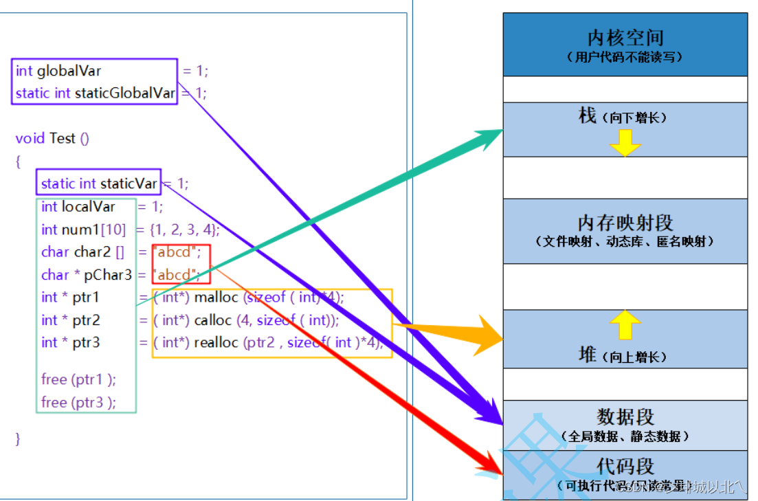 3. 数据段(静态区)(static)存放全局变量、静态数据。程序结束后由系统释放。