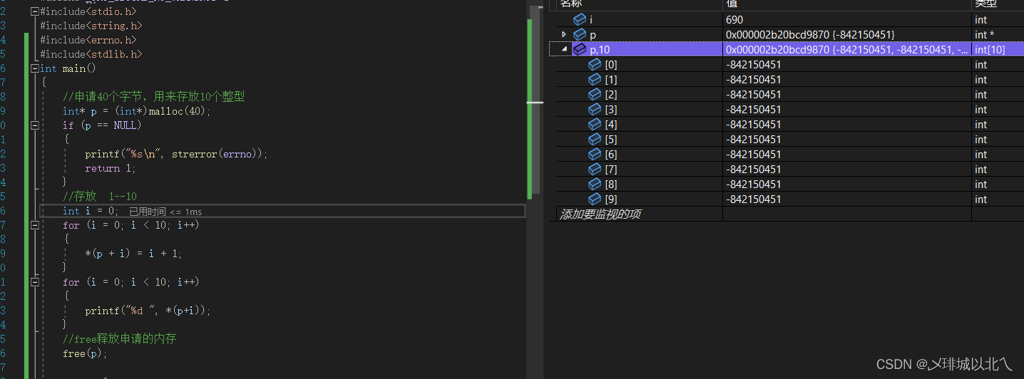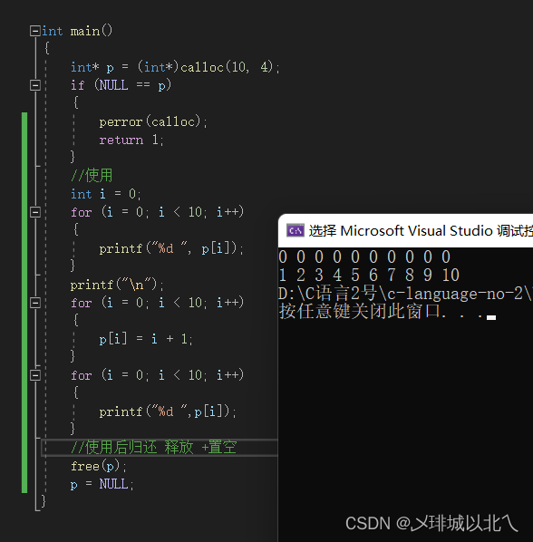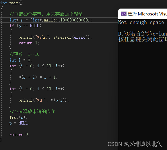 {//申请40个字节,用来存放10个整型int* p = (int*)malloc(40);if (p == NULL){printf("%s\n", strerror(errno));return 1;}//存放 1--10int i = 0;for (i = 0; i < 10; i++){*(p + i) = i + 1;}for (i = 0; i < 10; i++){printf("%d ", *(p+i));}//free释放申请的内存free(p);return 0;