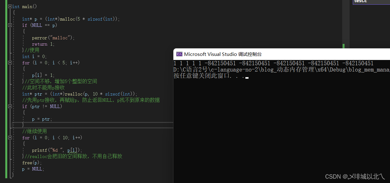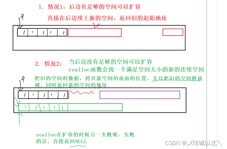 {int* p = (int*)malloc(5 * sizeof(int));if (NULL == p){perror("malloc");return 1;}//使用int i = 0;for (i = 0; i < 5; i++){p[i] = 1;}//空间不够,增加5个整型的空间//此时不能用p接收int* ptr = (int*)realloc(p, 10 * sizeof(int));//先用ptr接收,再赋给p,防止返回NULL,p找不到原来的数据if (ptr != NULL){p = ptr;ptr = NULL;//释放但不置空,需手动置空}//继续使用for (i = 0; i < 10; i++){printf("%d ", p[i]);}//realloc会把旧的空间释放,不用自己释放free(p);p = NULL;