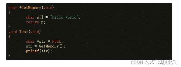 {char *str = NULL;GetMemory(str);strcpy(str, "hello world");printf(str);