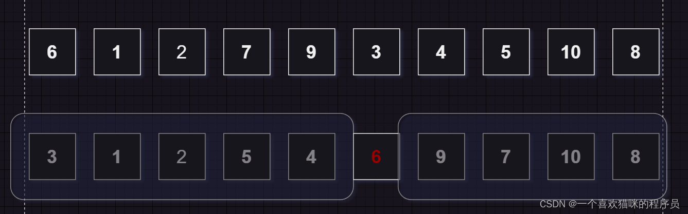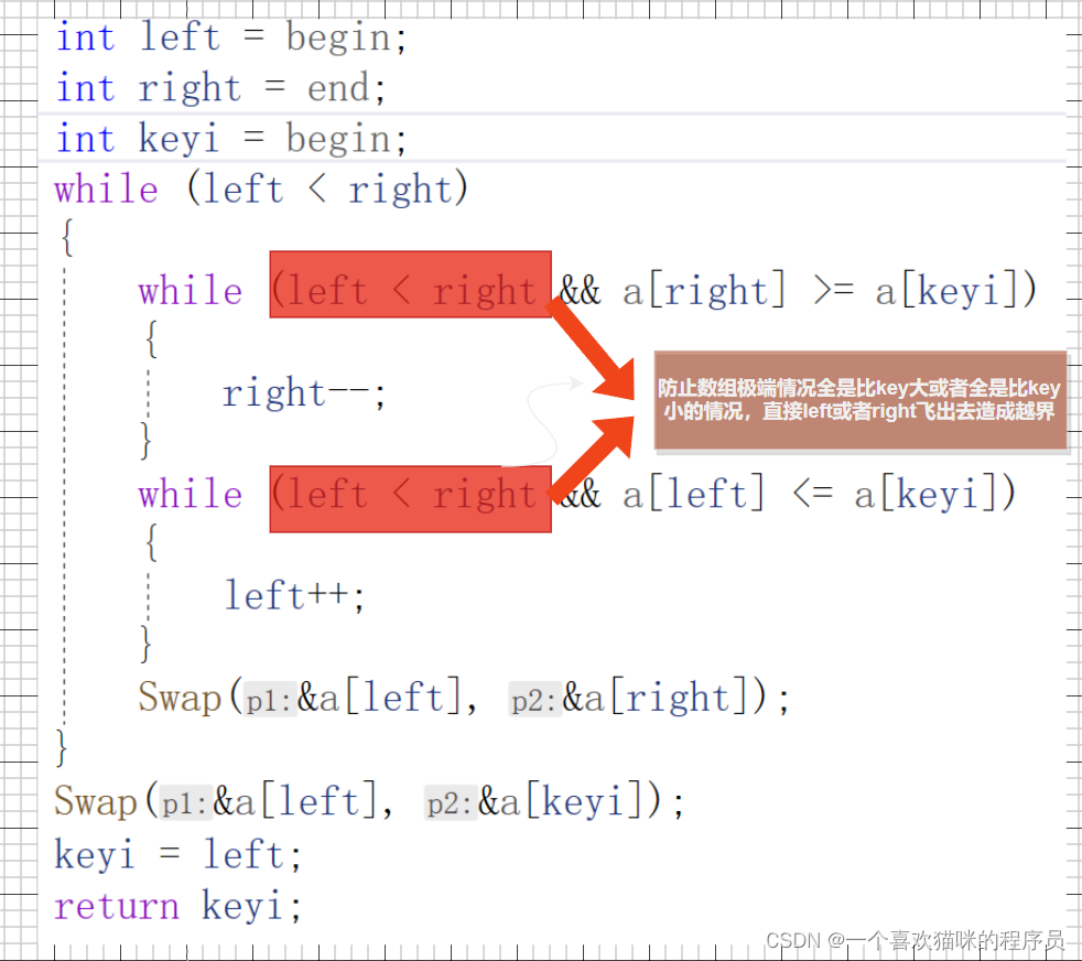 {int prev = begin;int cur = begin + 1;int keyi = begin;while (cur<=end){/*if (a[cur] < a[keyi]){Swap(&a[++prev], &a[cur]);}*/if (a[cur] < a[keyi]&&++prev!=cur){Swap(&a[prev], &a[cur]);}cur++;}Swap(&a[prev], &a[keyi]);keyi = prev;return keyi;