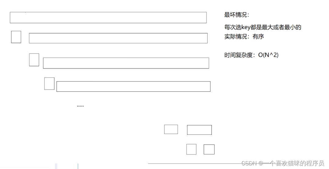 但事实上可能会遇到极端情况:就是我们每次取到的都是最大值或者最小值,那么快排的时间复杂度达到最低O(N^2)