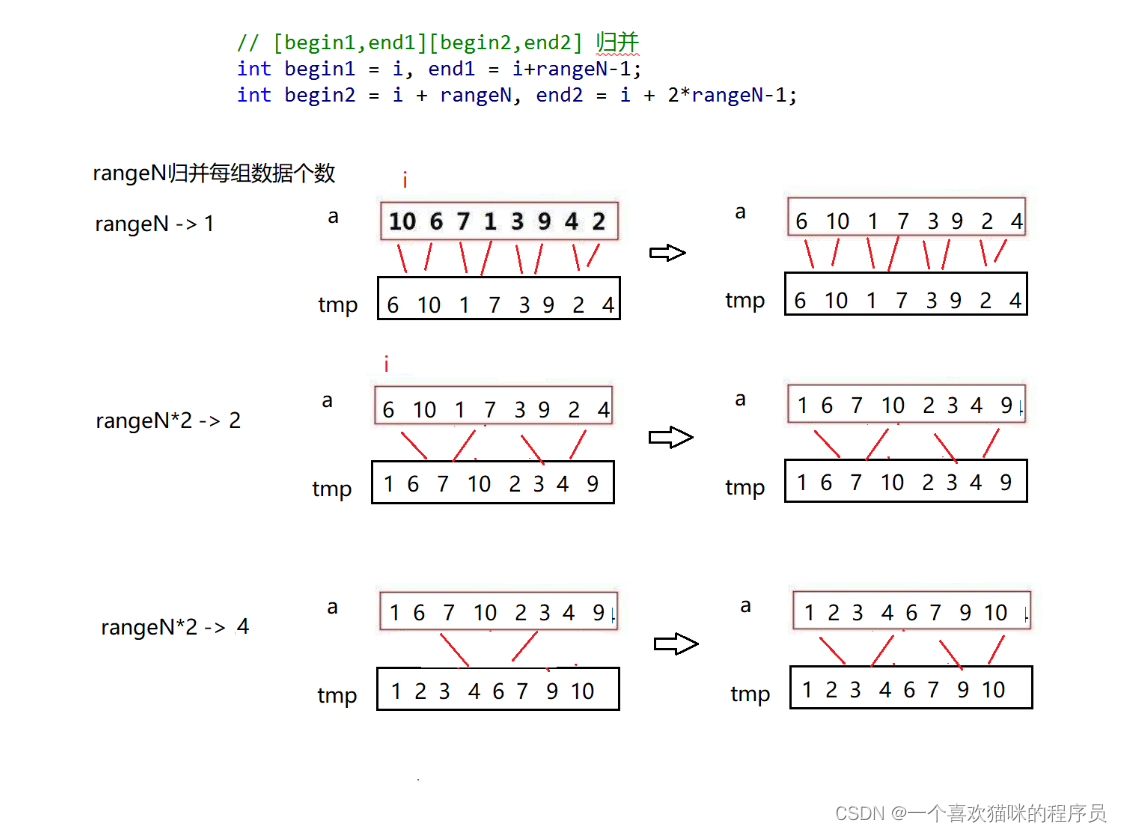 {int* tmp = (int*)malloc(sizeof(int) * n);if (tmp == NULL){perror("malloc fail");exit(-1);}int RangN = 1;while (RangN < n){for (int i = 0; i < n; i += 2 * RangN){int begin1 = i;int end1 = i + RangN - 1;int begin2 = i + RangN;int end2 = i + 2 * RangN - 1;int j = i;if (end1>=n)// 修正区间 ->拷贝数据 归并完了整体拷贝 or 归并每组拷贝{end1 = n - 1;begin2 = n;// 不存在区间end2 = n - 1;}else if (begin2 >= n){begin2 = n;end2 = n - 1;}else if(end2>=n){end2 = n - 1;}while (begin1 <= end1 && begin2 <= end2){if (a[begin1] < a[begin2]){tmp[j++] = a[begin1++];}else{tmp[j++] = a[begin2++];}}while (begin1 <= end1){tmp[j++] = a[begin1++];}while (begin2 <= end2){tmp[j++] = a[begin2++];}memcpy(a + i, tmp + i, sizeof(int) * (end2 - i + 1));}RangN *= 2;}free(tmp);tmp = NULL;