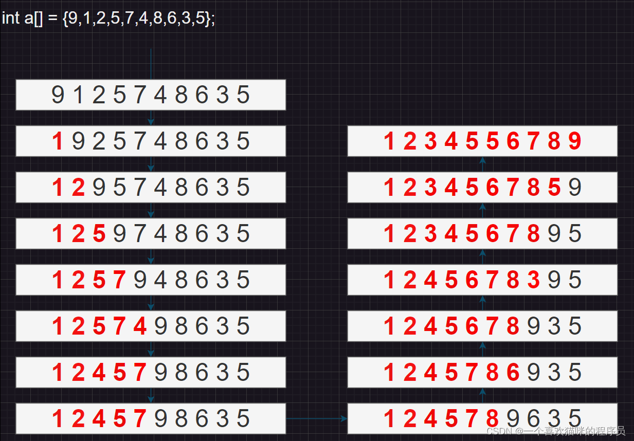 将此过程一直重复的话可以可以完成上图的情况。(以数组a为例,来观察一下各个过程)