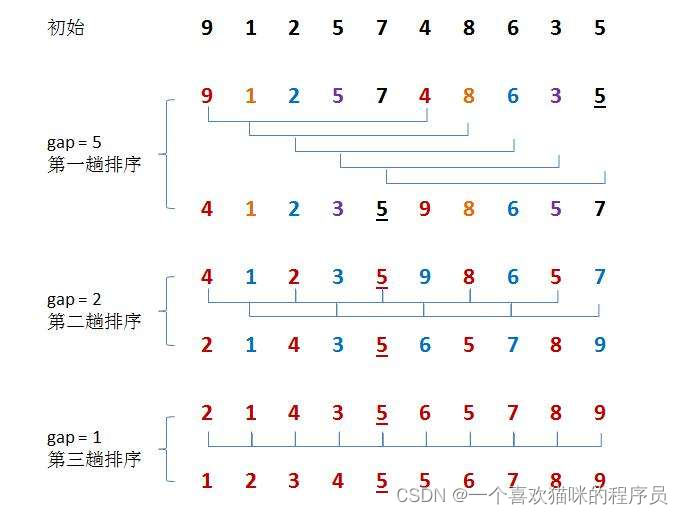 设定一个gap=n/2,将相距gap位置的两个数作比较,如果前面的小于后面交换以此循环