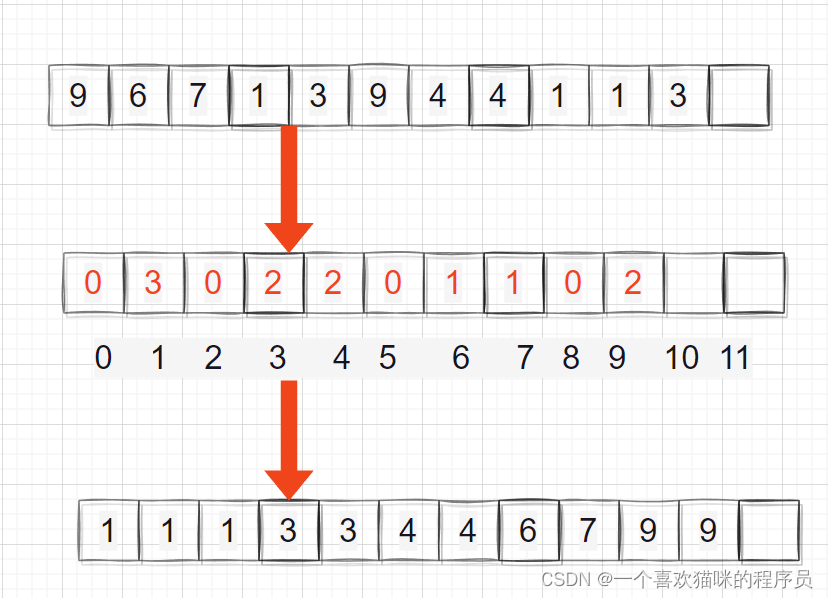 相对映射:count数组中下标为i的位置记录的是arr数组中数字min+i出现的次数。