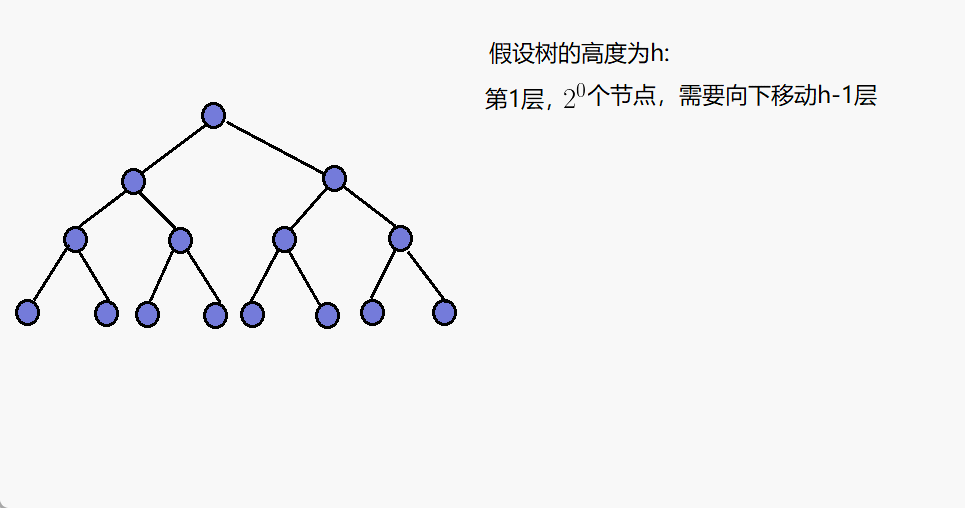 第h层,有2^(h-1)个节点,需要向下调整0次(直接不算,从第h-1层开始算)。