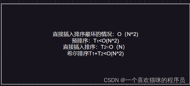 因为直接插入排序前的待排序列已是接近有序的情况了,因此时间复杂度为O(N),只要控制预排序阶段的时间复杂度不超过O(N^2),那么整体的时间复杂度就比直接插入排序的时间复杂度低了。