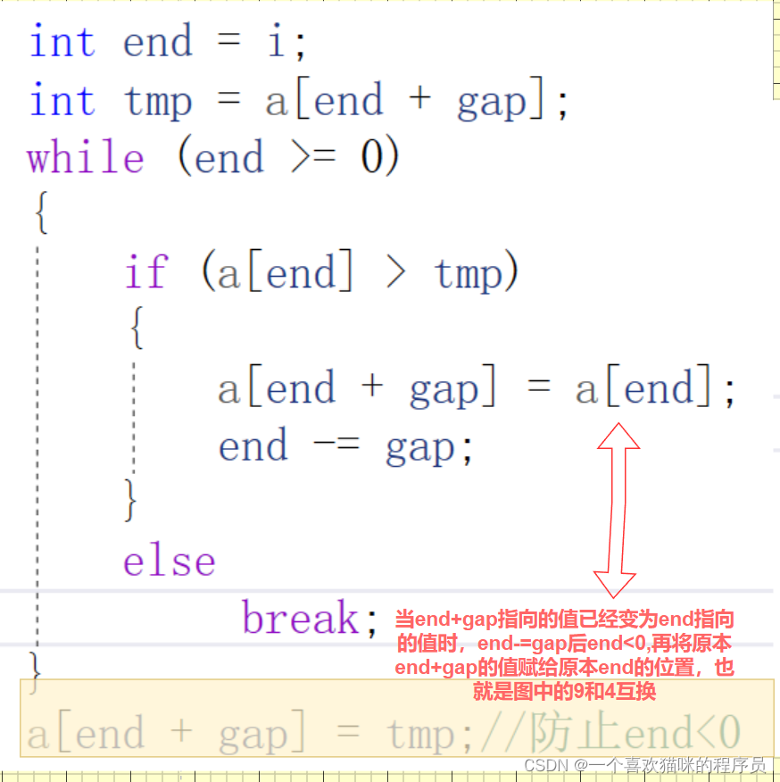 {int gap = n;while (gap > 1){gap = gap/ 2;for (int i = 0; i < n - gap; i++)//i++并排运算{int end = i;int tmp = a[end + gap];while (end >= 0){if (a[end] > tmp){//Swap(&a[end], &a[end + gap]);a[end + gap] = a[end];end -= gap;}elsebreak;}a[end + gap] = tmp;//防止end<0}}