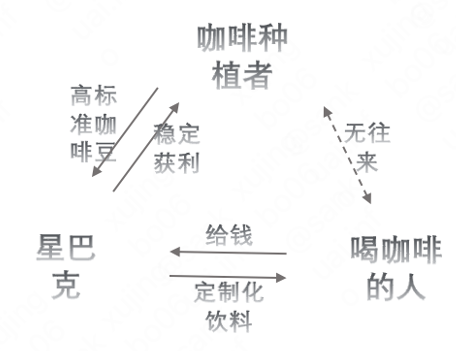 这是一个相对稳定的结构,咖啡种植者、喝咖啡的人与星巴克都有联系,而且咖啡种植者与喝咖啡的人并无直接来往,这一结构稳定且同时给三方带来价值,因此,星巴克模式长期盈利且不断扩张。