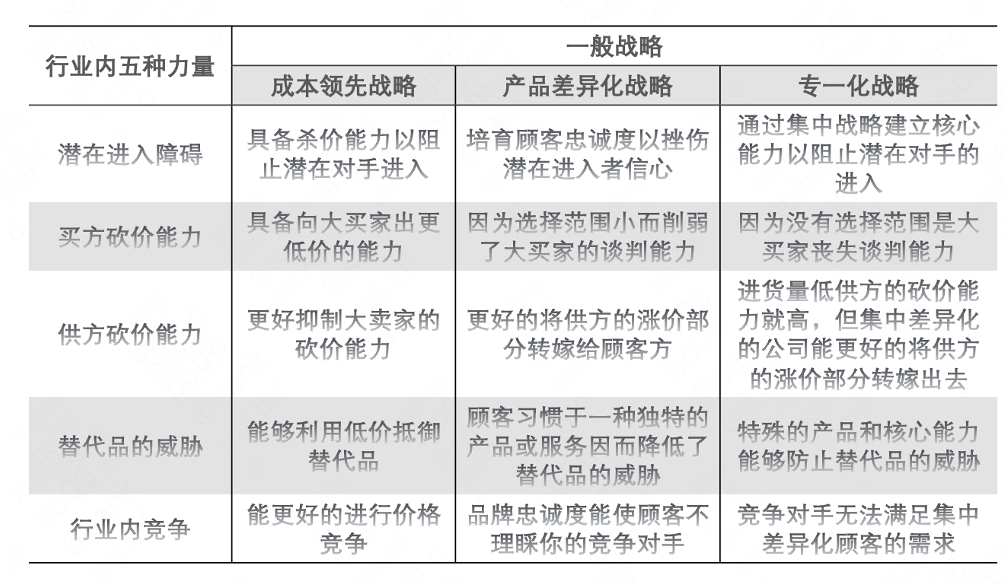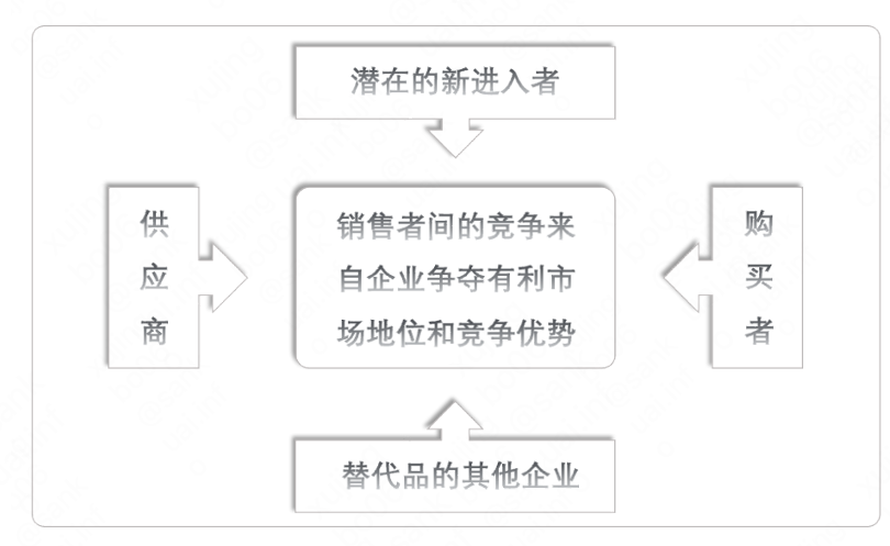 这个五力框架表明:行业内的竞争程度受如下多方影响:供应商和购买者议价能力、新竞争对手和替代品的威胁,以及现有竞争对手竞争激烈程度。模型的核心在于选择行业中最有吸引力的竞争位置,分析思路为: