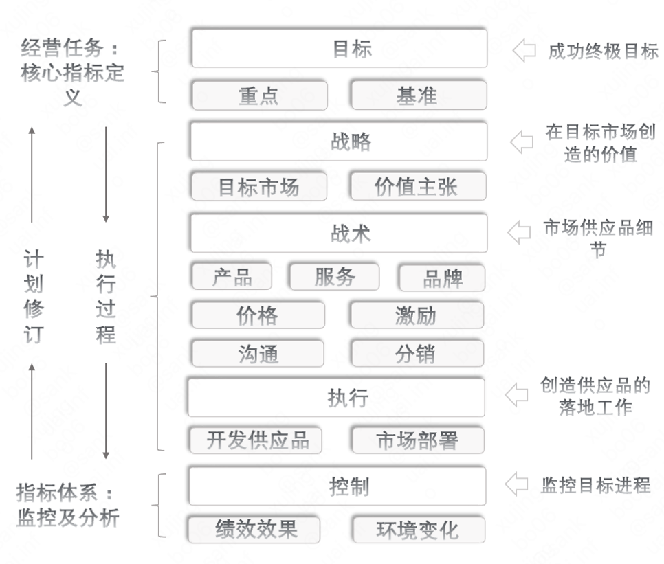 通过上面五个环节的梳理,行动计划逐渐落地到企业中,执行过程中基于对核心指标的监控和分析,反复优化问题点,完成企业与市场之间价值交换的过程。