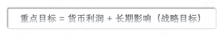 目标设定可以分为两个方面:设定重点目标、设置绩效基准,在重点目标中我们同样可以切分成两个部分:货币利润、战略目标,即: