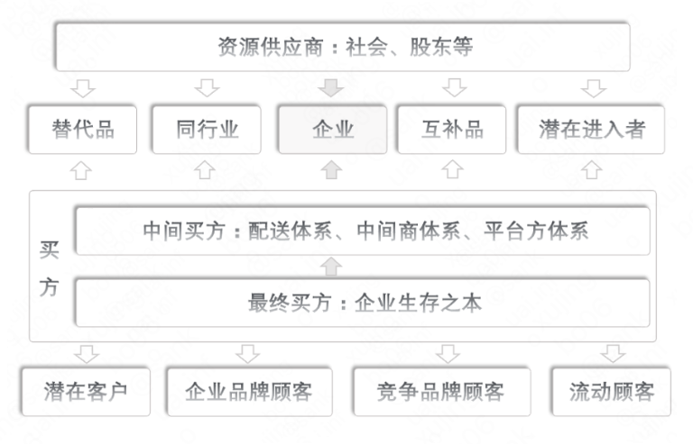 在这基础上设计出了六力互动模型,这一模型将企业独立出来,并新增了互补品竞争者,从企业的角度思考竞争环境,并基于商业供需关系构建层级思考结构: