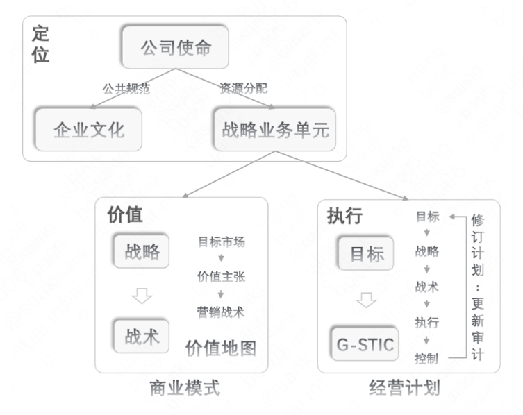 经营即企业洞察市场环境,确定自身定位,明确价值主张,最后满足客户需求的过程。这中间涉及到三个层面:公司、业务单元和特定市场产品。这三个层面从大到小逐渐细化,负责的方向各不一样: