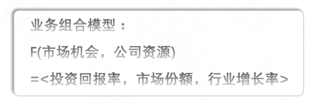 企业从<市场机会、公司资源>两个方面综合衡量每个战略业务单元,比较各战略业务单元在<投资回报率、市场份额、行业增长率>三个方面的不同表现,组合出不同业务组合模型。