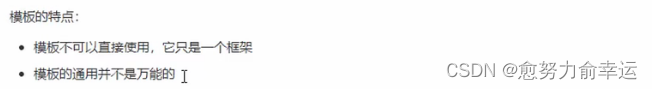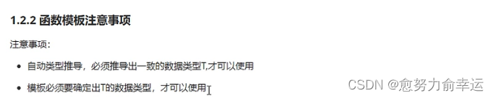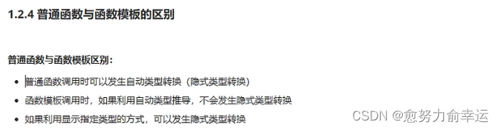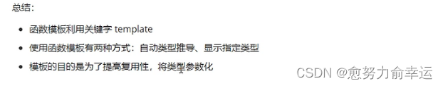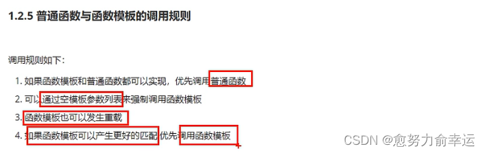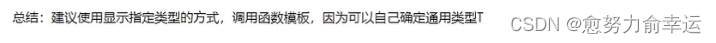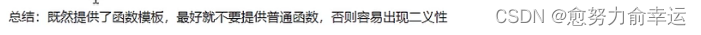 {int a = 10;int b = 20;myPrint(a, b);//普通函数和函数模板都可以调用,优先调用普通函数//通过空模板的参数列表,强制调用函数模板myPrint<>(a, b);//<>这个里面什么都不要写,模板的参数列表就是<>,//如果是空模板的参数列表,那么<>里面就什么都不要写//3.函数模板也可以发生函数重载myPrint(a, b,100);//4.如果函数模板可以产生更好的匹配,优先调用函数模板char c1 = 'a';char c2 = 'b';myPrint(c1, c2);//普通函数和函数模板都可以调用,//因为普通函数是可以发生强制类型转换(隐式类型转换)的,此时调用的时模板//编译器认为调用普通函数需要把char转成int ,太麻烦了//不如直接推导出T就是char//也就是如果模板不发生隐式类型转换就优先调用模板}int main()