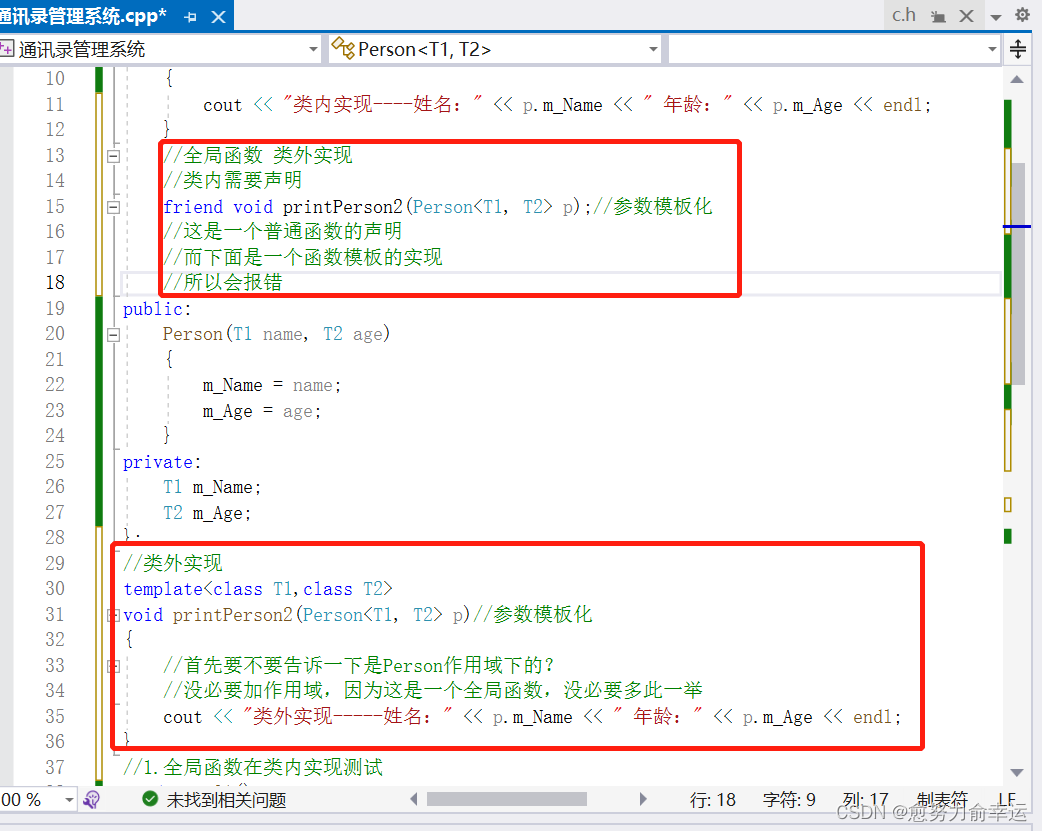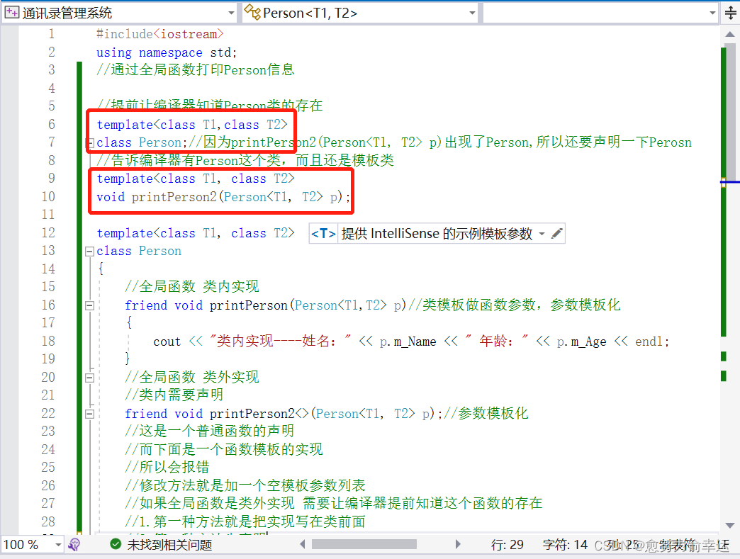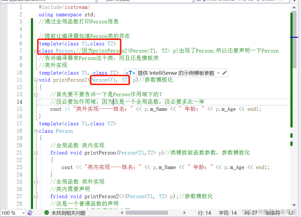 {//全局函数 类内实现friend void printPerson(Person p)//类模板做函数参数,参数模板化{cout << "类内实现----姓名:" << p.m_Name << " 年龄:" << p.m_Age << endl;}//全局函数 类外实现//类内需要声明friend void printPerson2<>(Person p);//参数模板化//这是一个普通函数的声明//而下面是一个函数模板的实现//所以会报错//修改方法就是加一个空模板参数列表//如果全局函数是类外实现 需要让编译器提前知道这个函数的存在//1.第一种方法就是把实现写在类前面//2.第二种方法先声明
