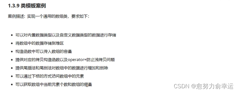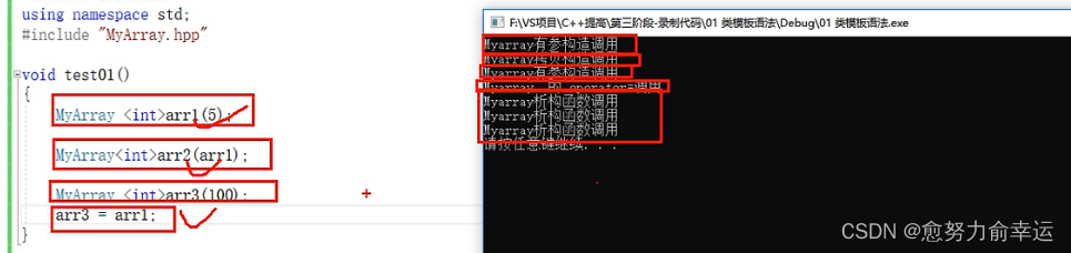 public://有参构造MyArray(int capacity){cout << "MyArray有参构造调用" << endl;m_Capcity = capacity;m_Size = 0;pAddress = new T[capacity];}//拷贝构造MyArray(const MyArray& arr){cout << "MyArray拷贝构造调用" << endl;m_Capcity = arr.m_Capcity;m_Size = arr.m_Size;//pAddress = arr.pAddress;//浅拷贝//深拷贝pAddress = new T[arr.m_Capcity];//将arr中的数据都拷贝过来for (int i = 0; i < arr.m_Size; i++){pAddress[i] = arr.pAddress[i];}}//operator= 防止浅拷贝问题MyArray& operator=(const MyArray &arr){cout << "MyArray operator=调用" << endl;//先判断原来堆区是否有数据,如果有先释放if (pAddress != NULL){delete[] pAddress;pAddress = NULL;}m_Capcity = arr.m_Capcity;m_Size = arr.m_Size;//深拷贝pAddress = new T[arr.m_Capcity];//将arr中的数据都拷贝过来for (int i = 0; i < arr.m_Size; i++){pAddress[i] = arr.pAddress[i];}return *this;}//析构函数//堆区数据手动开辟 手动释放~MyArray(){if (pAddress != NULL){cout << "MyArray 析构函数调用" << endl;delete[] pAddress;pAddress = NULL;//防止野指针}}