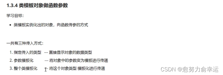 {//全局函数 类内实现friend void printPerson(Person &p)//类模板做函数参数,参数模板化{cout << "类内实现----姓名:" << p.m_Name << " 年龄:" << p.m_Age << endl;}//全局函数 类外实现//类内需要声明friend void printPerson2<>(Person p);//参数模板化//这是一个普通函数的声明//而下面是一个函数模板的实现//所以会报错//修改方法就是加一个空模板参数列表//如果全局函数是类外实现 需要让编译器提前知道这个函数的存在//1.第一种方法就是把实现写在类前面//2.