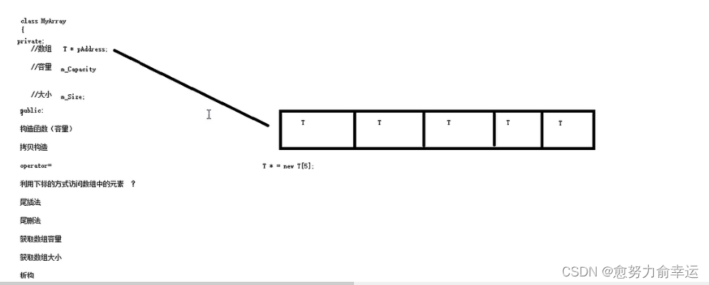 private:T* pAddress;//指针指向堆区开辟的真实数组int m_Capcity;//数组容量int m_Size;//数组大小