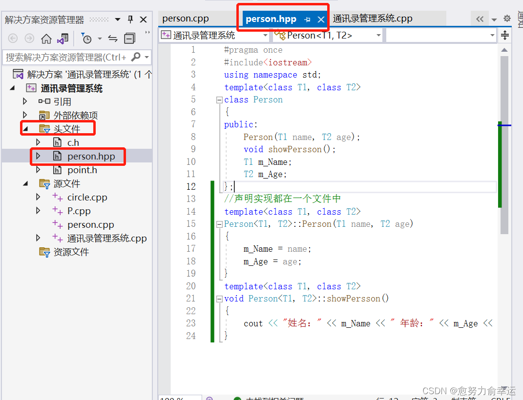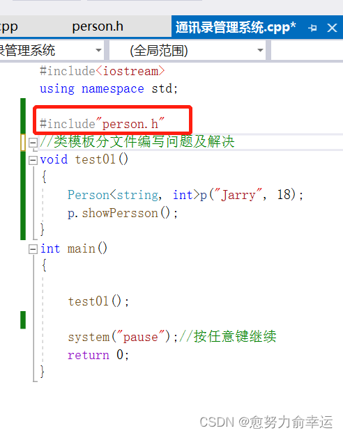 public:Person(T1 name, T2 age);/*{m_Name = name;m_Age = age;}*/void showPerson();/*{cout << "姓名:" << m_Name << " 年龄:" << m_Age << endl;}*/T1 m_Name;T2 m_Age;