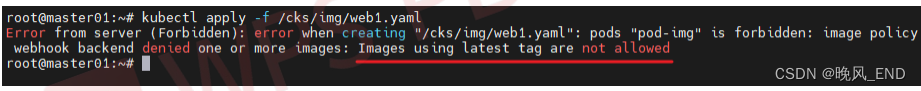 最后需要执行/cks/img/web1.yaml,如果此pod部署失败,表示imagePolicyWebhook插件启用成功。