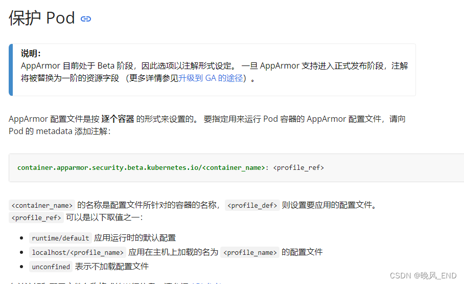 由于注解是比较长的,因此这里还是需要使用官方文档的,地址为:使用 AppArmor 限制容器对资源的访问 | Kubernetes