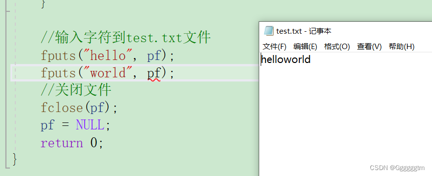 {//读的方式打开test.txt文件FILE* pf = fopen("test.txt", "w");if (pf == NULL){perror("fopen");return 1;}//输入字符到test.txt文件fputs("hello\n", pf);fputs("world\n", pf);//关闭文件fclose(pf);pf = NULL;return 0;