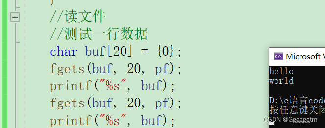 {FILE* pf = fopen("test.txt", "r");if (NULL == pf){perror("fopen");return 1;}//读文件//测试一行数据char buf[20] = {0};fgets(buf, 20, pf);printf("%s", buf);fgets(buf, 20, pf);printf("%s", buf);//关闭文件fclose(pf);pf = NULL;return 0;