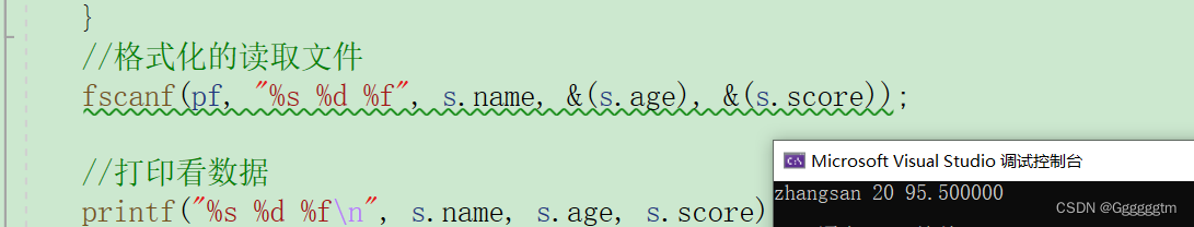 {struct S s = { 0 };FILE* pf = fopen("test.txt", "r");if (NULL == pf){perror("fopen");return 1;}//格式化的读取文件fscanf(pf, "%s %d %f", s.name, &(s.age), &(s.score));//打印看数据printf("%s %d %f\n", s.name, s.age, s.score);//关闭文件fclose(pf);pf = NULL;return 0;