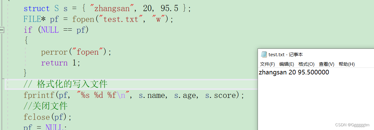 {struct S s = { "zhangsan", 20, 95.5 };FILE* pf = fopen("test.txt", "w");if (NULL == pf){perror("fopen");return 1;}// 格式化的写入文件fprintf(pf, "%s %d %f\n", s.name, s.age, s.score);//关闭文件fclose(pf);pf = NULL;return 0;
