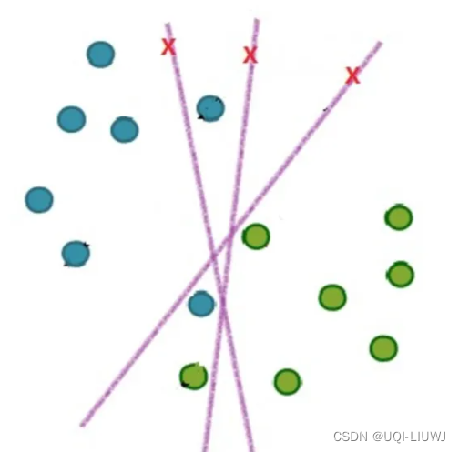 但我们可能会碰到的一种情况是样本点不是线性可分的,比如: