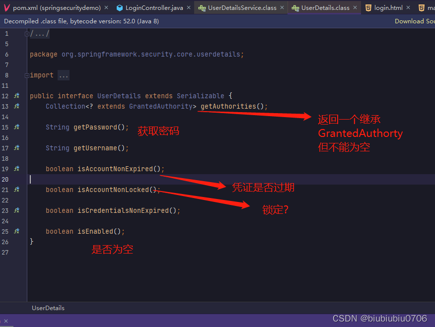 而返回的UserDetails也是个接口,正常肯定由个实现类