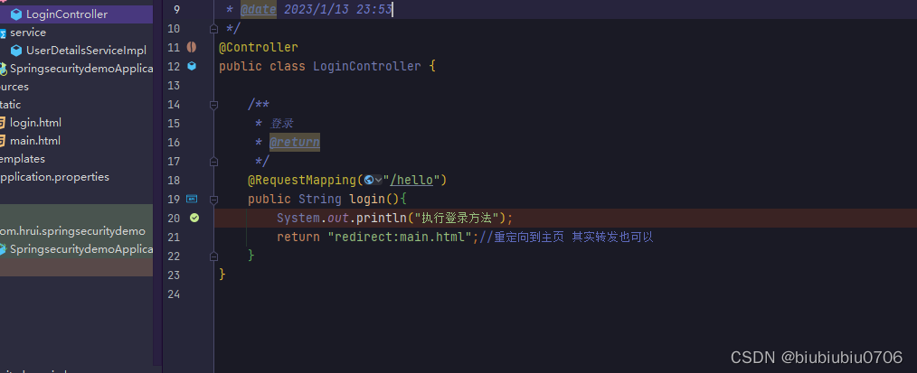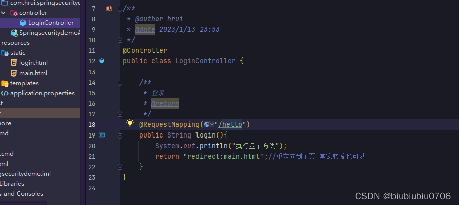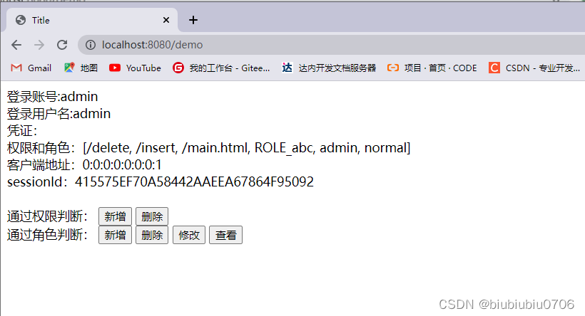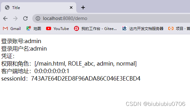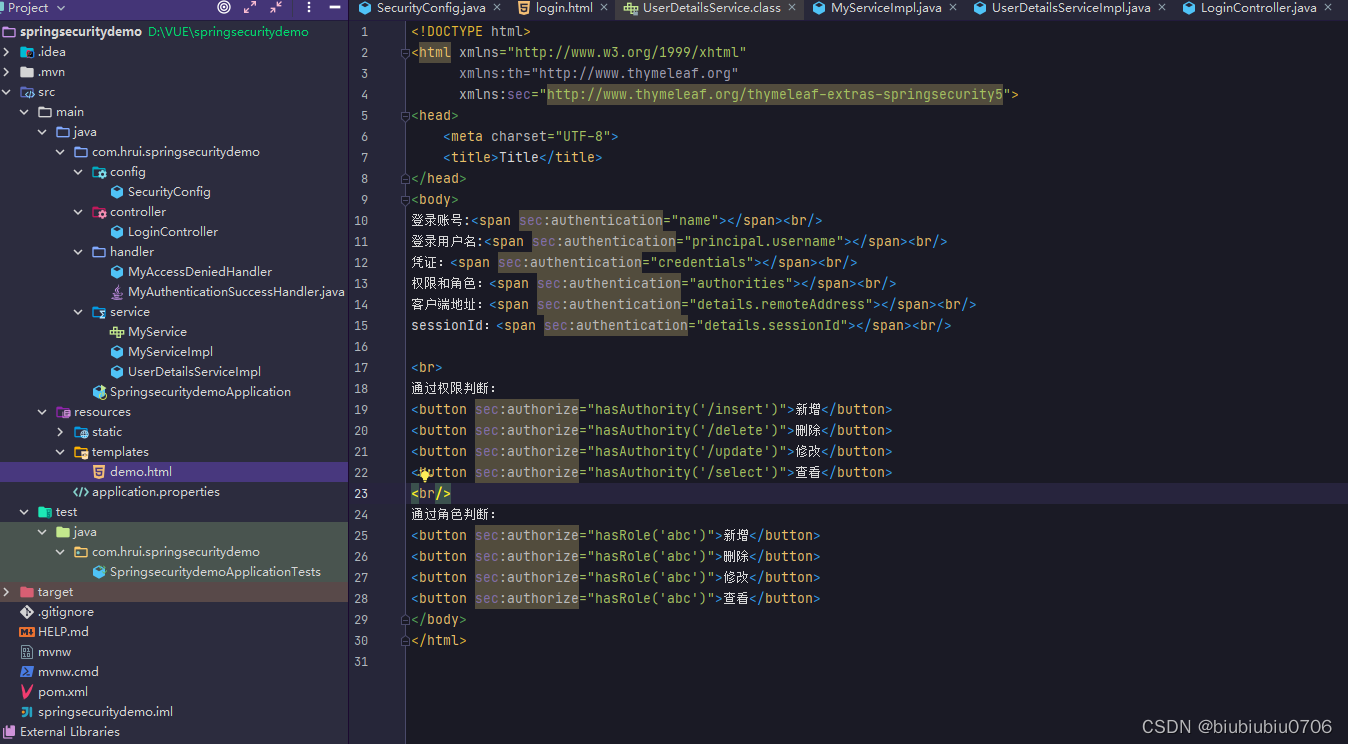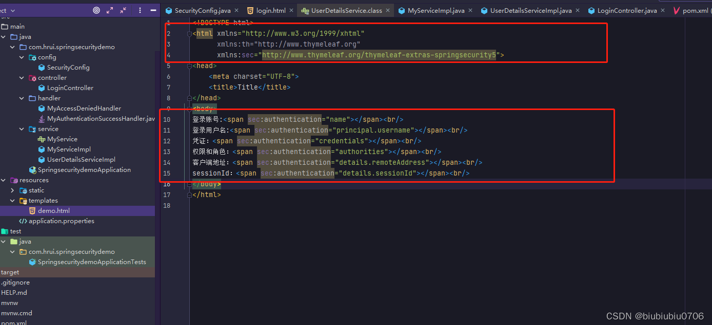 可以在html页面中通过 sec:authentication="" 获取 UsernamePasswordAuthenticationToken 中所有 getXXX 的内容,包含父类中的 getXXX 的 内容。 根据源码得出下面属性: name :登录账号名称 principal :登录主体,在自定义登录逻辑中是 UserDetails credentials :凭证 authorities :权限和角色 details :实际上是 WebAuthenticationDetails 的实例。可以获取 remoteAddress (客 户端 ip)和 sessionId (当前 sessionId) 演示下 templates新建个demo.html