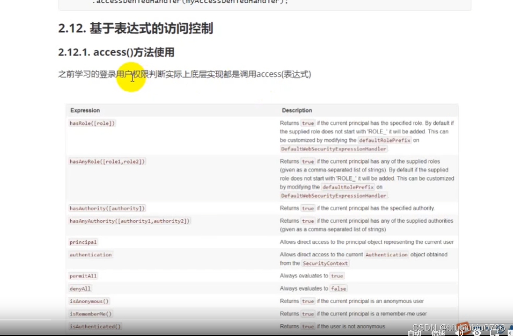 @PreAuthorze:表示访问方法或类在执行之前先判断权限,大多情况下都是使用这个注解,注解的参数和access()方法参数取值相同,都是权限表达式access("hasAuthority('ROLE_abc')")